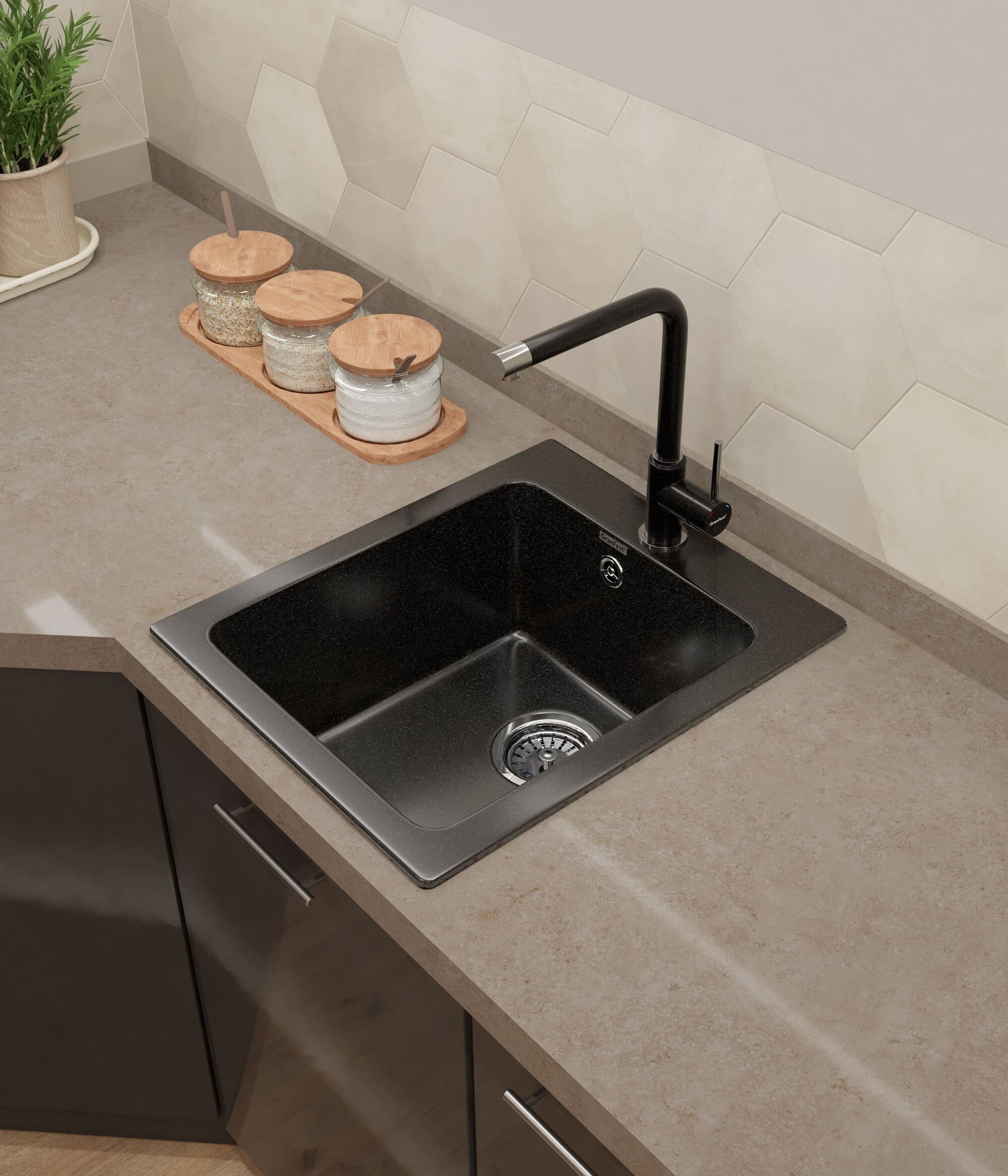 Мойка кухонная врезная, GranFest, Urban, кварцевый песок, 580х490 мм, одна чаша, черная, GF-UR-658