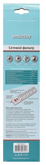 Сетевой фильтр с USB Smartbuy, 10А, 2 200 Вт, 5 розеток, длина 3 м, белый