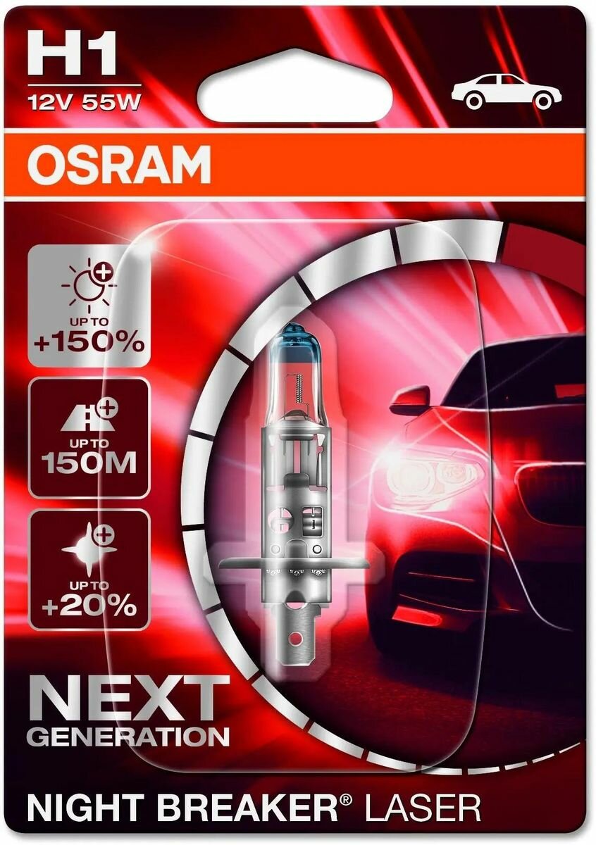 H1 12v- 55w (p14,5s) (+150 света) night breaker laser (блистер 1шт.), OSRAM 64150NL01B (1 шт.)