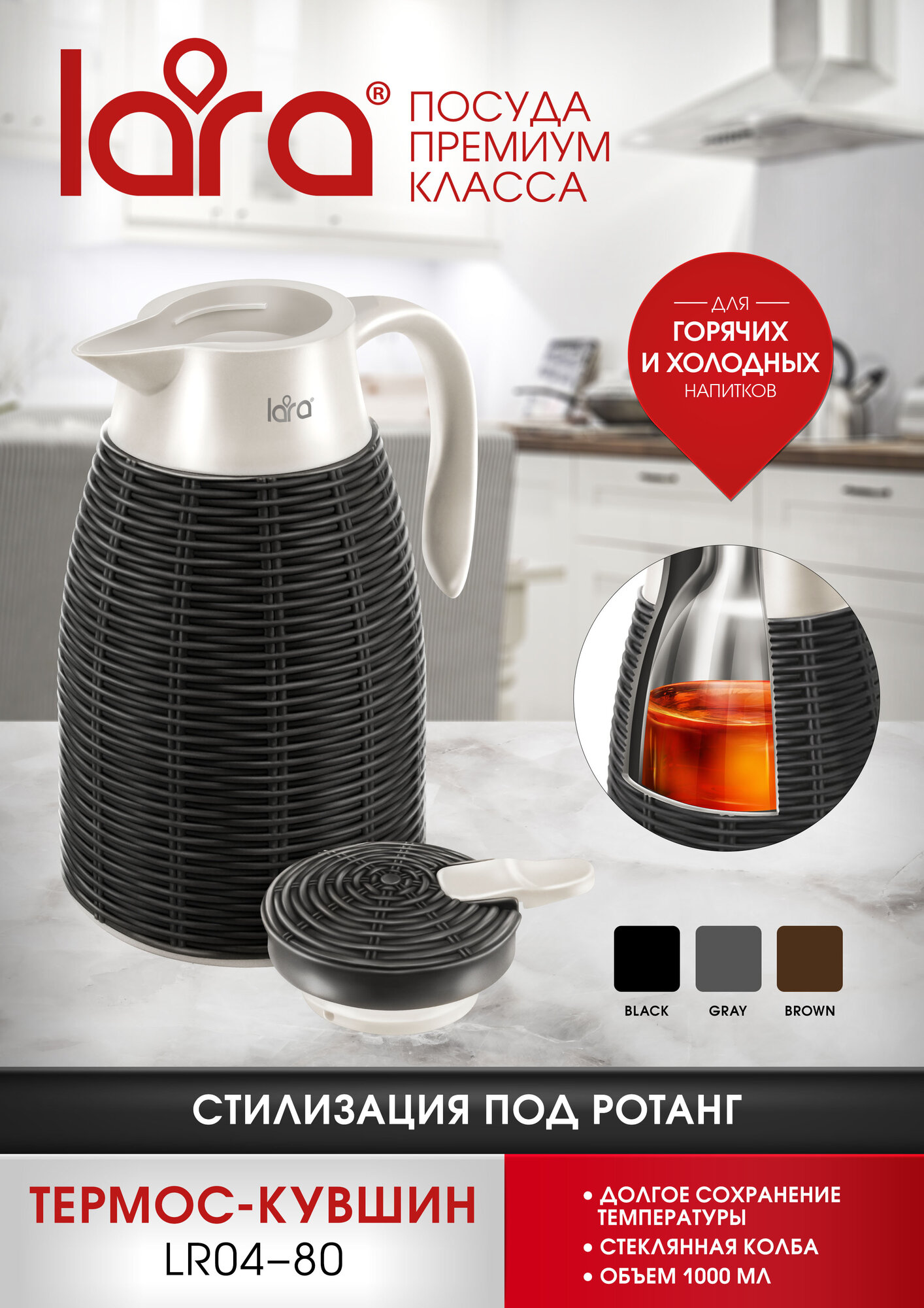 Купить Термос LARA LR04-80 Black/1 л/ стеклянная колба/ стилизация под ротанг/ долгое сохранение