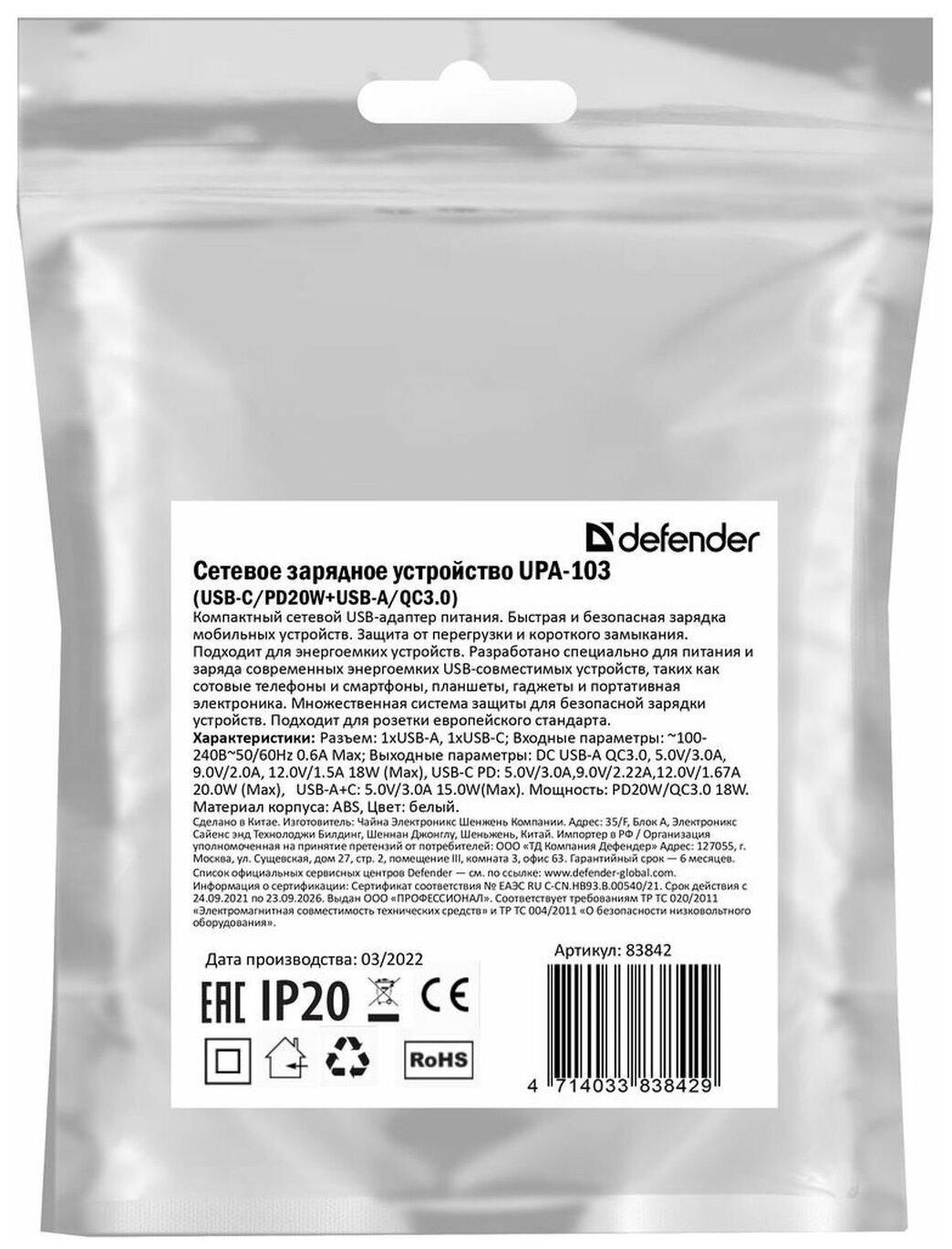 Defender 83842, Defender Сетевое ЗУ UPA-103 USB-C/PD20W+USB-A/QC3.0