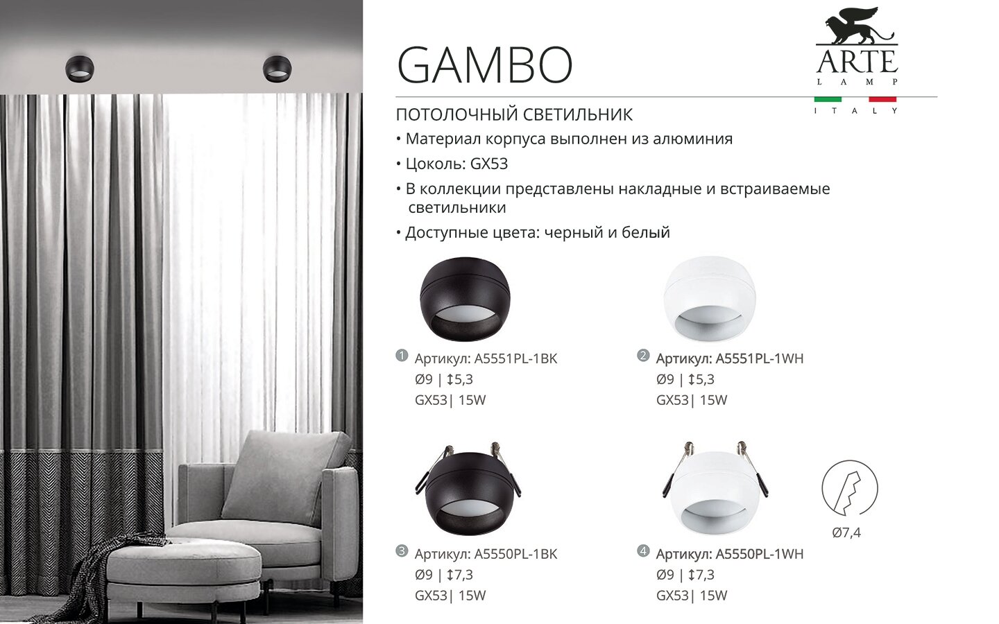 Светильник встраиваемый Arte Lamp GAMBO, A5550PL-1WH, 15W, GX53, Стиль Современный