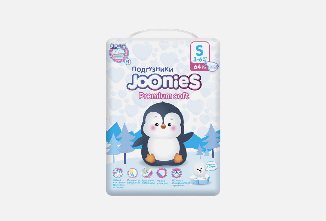 JOONIES Premium Soft подгузники, размер S (3-6 кг), 64 шт.
