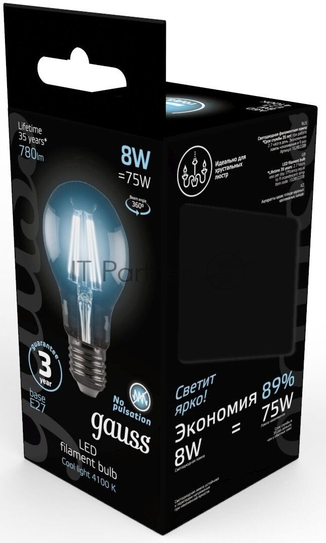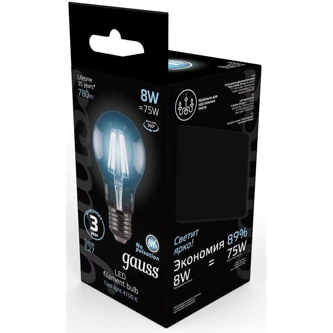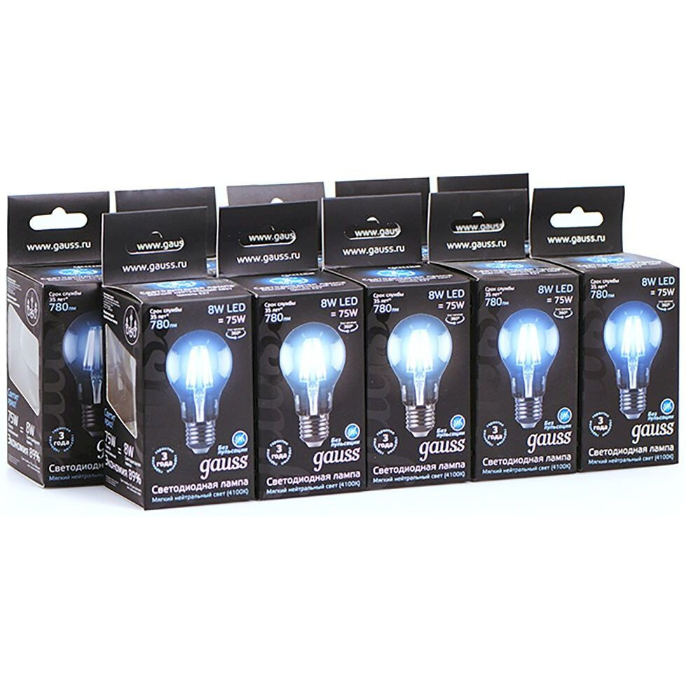 Набор из 10 штук Лампа Gauss Filament А60 8W 780lm 4100К Е27 LED 1/10/40