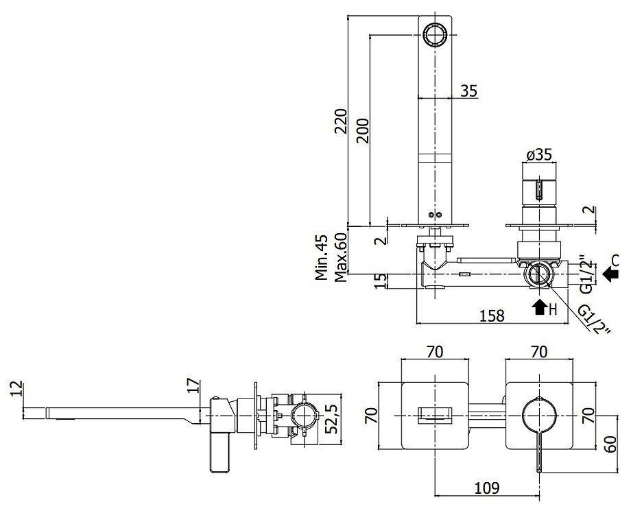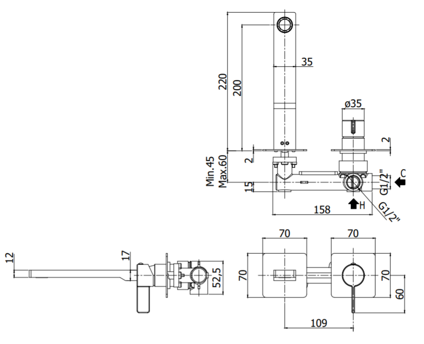 Смеситель Paffoni, серии ROCK, для раковины встраиваемый с изливом 200мм с накладками из нерж. Стали 2 шт. 70х70мм RO105CR70