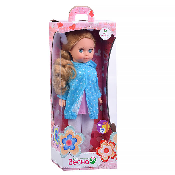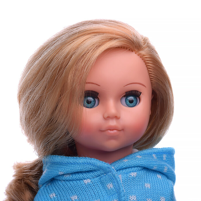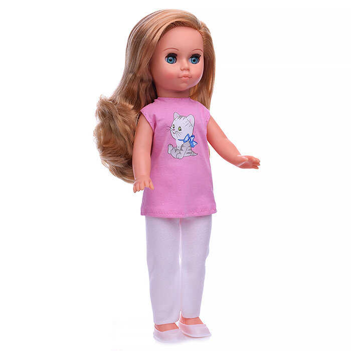 | Комплектация | кукла, вязаное пальто с капюшоном и застежкой сверху, трикотажные брюки, розовая футболка с термоаппликацией "Котенок", трусики, пластмассовые туфельки |
