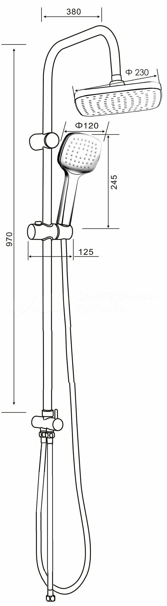 | Дополнительная информация | покрытие черный матовый; высота стойки для душа: 970 мм; диаметр душевой лейки: 120 мм; длина верхнего душа: 265 мм; ширина верхнего душа: 265 мм |