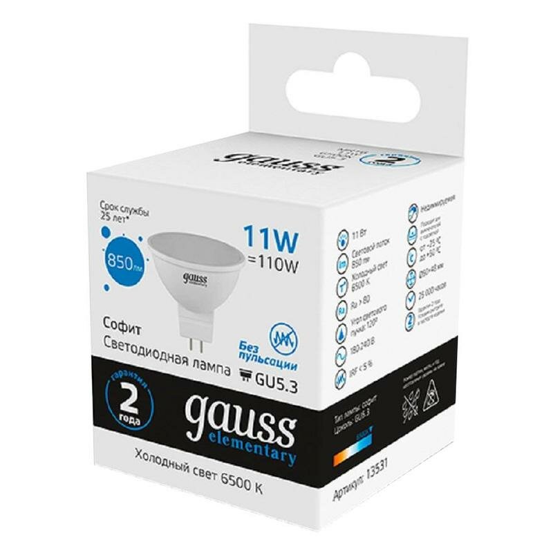 Ниже Вы можете прочитать отзывы на Светодиодная лампа Gauss Elementary MR16 11W 850lm 6500K GU5.3 LED (10шт), ознакомится с подробными характеристиками, посмотреть интересные обзоры и фотографии на Светодиодная лампа Gauss Elementary MR16 11W 850lm 6500K GU5.3 LED (10шт).