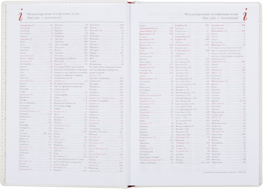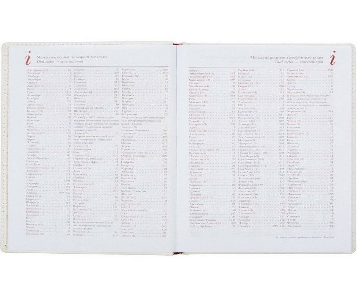| Дополнительная информация | 14 страниц со справочной информацией, 18 страниц - телефонная книга; обложка подходит для тиснения; вес 396 г |