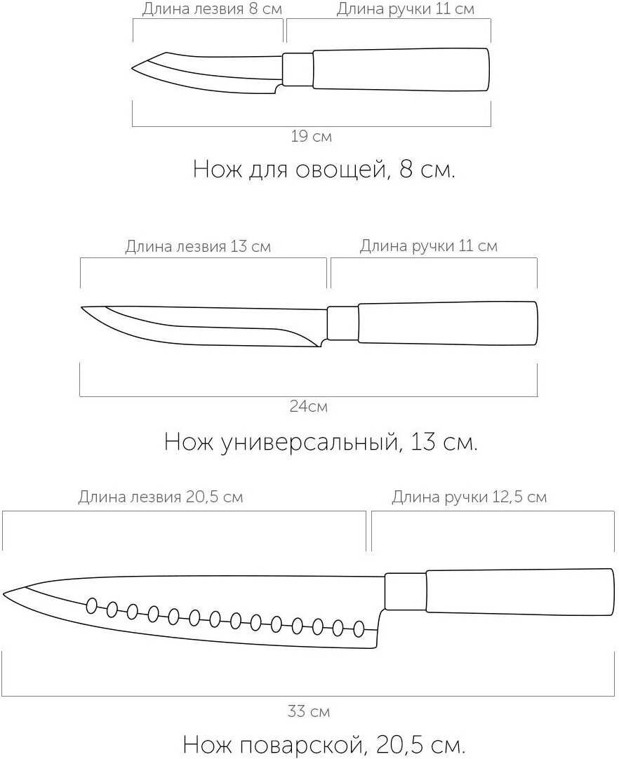 | Типы ножей в наборе | нож для овощей, универсальный нож, шеф-нож |