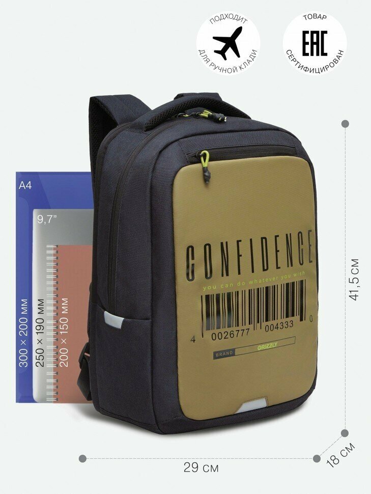 Рюкзак Grizzly "Confidence", 29х41,5х18 см, 2 отделения, 3 кармана, анатомическая спинка, черный (RU-334-1/1)
