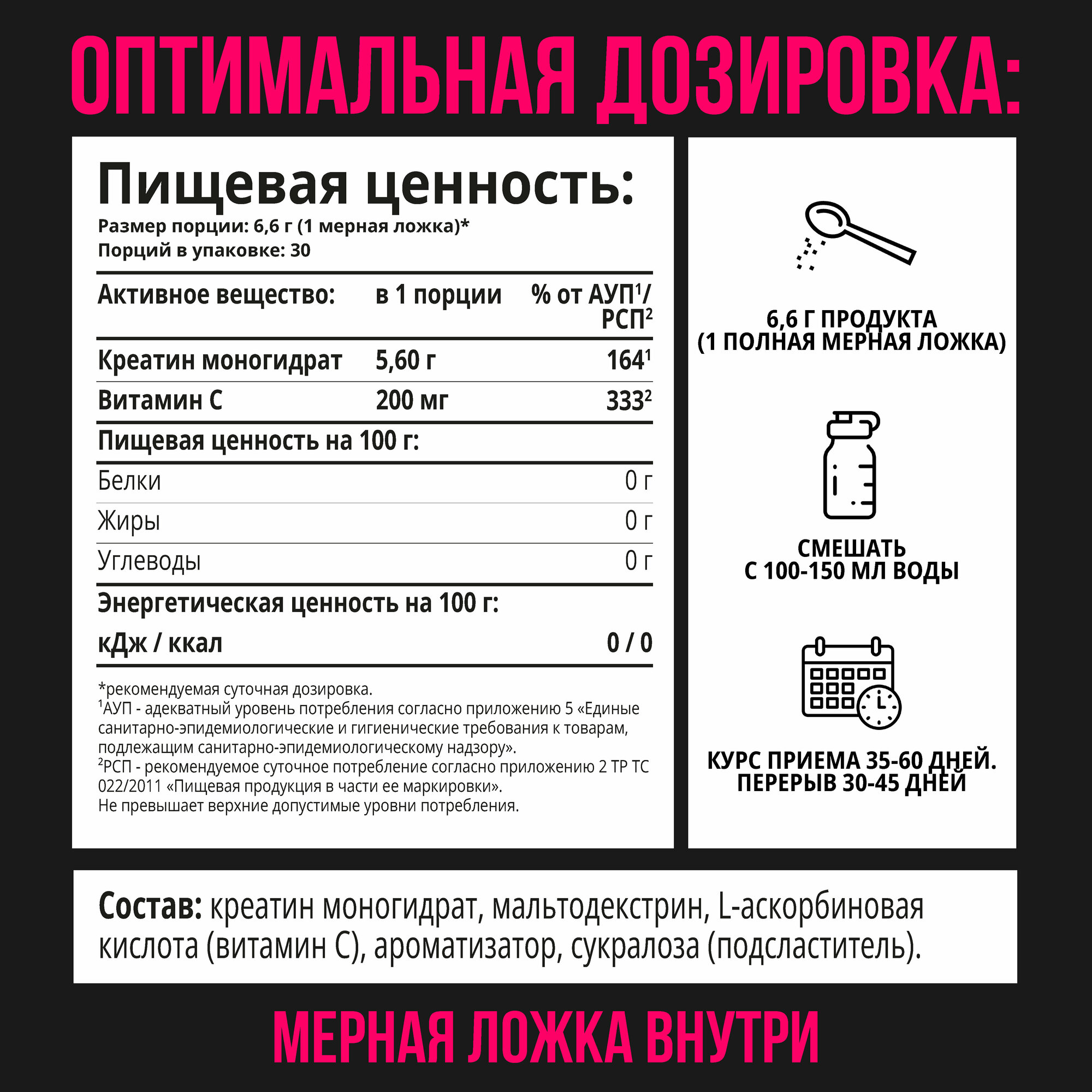 | Дополнительная информация | рекомендации по применению: Рекомендуется принимать по одной мерной ложке (6.6 г), растворив порошок в 250 мл воды или сока; состав: креатин моногидрат, мальтодекстрин, аскорбиновая кислота, подсластитель - сукралоза, ароматизатор |