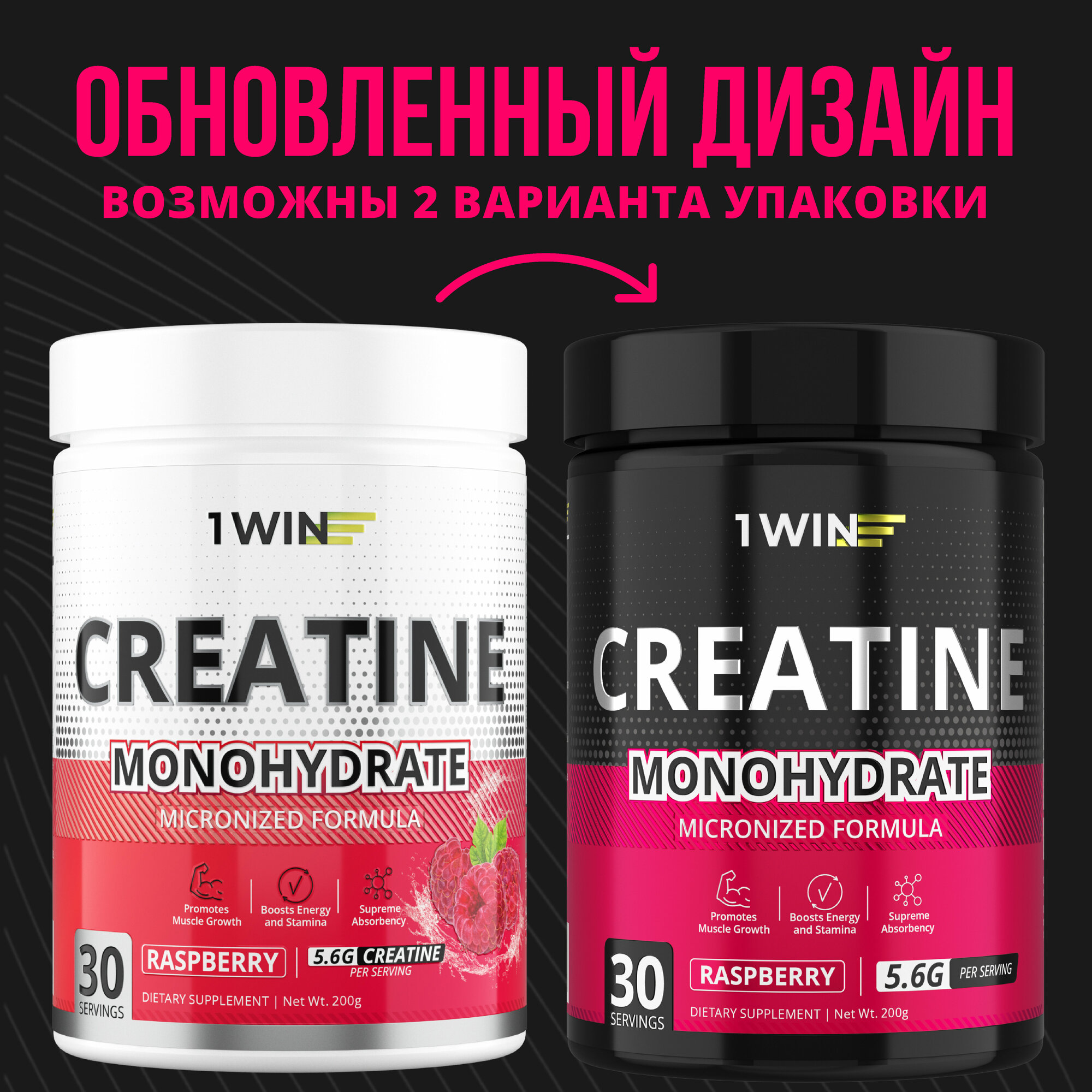 Креатин моногидрат порошок 1WIN, Creatine Monohydrate, Вкус Малина, 60 порций, спортивное питание для набора массы тела