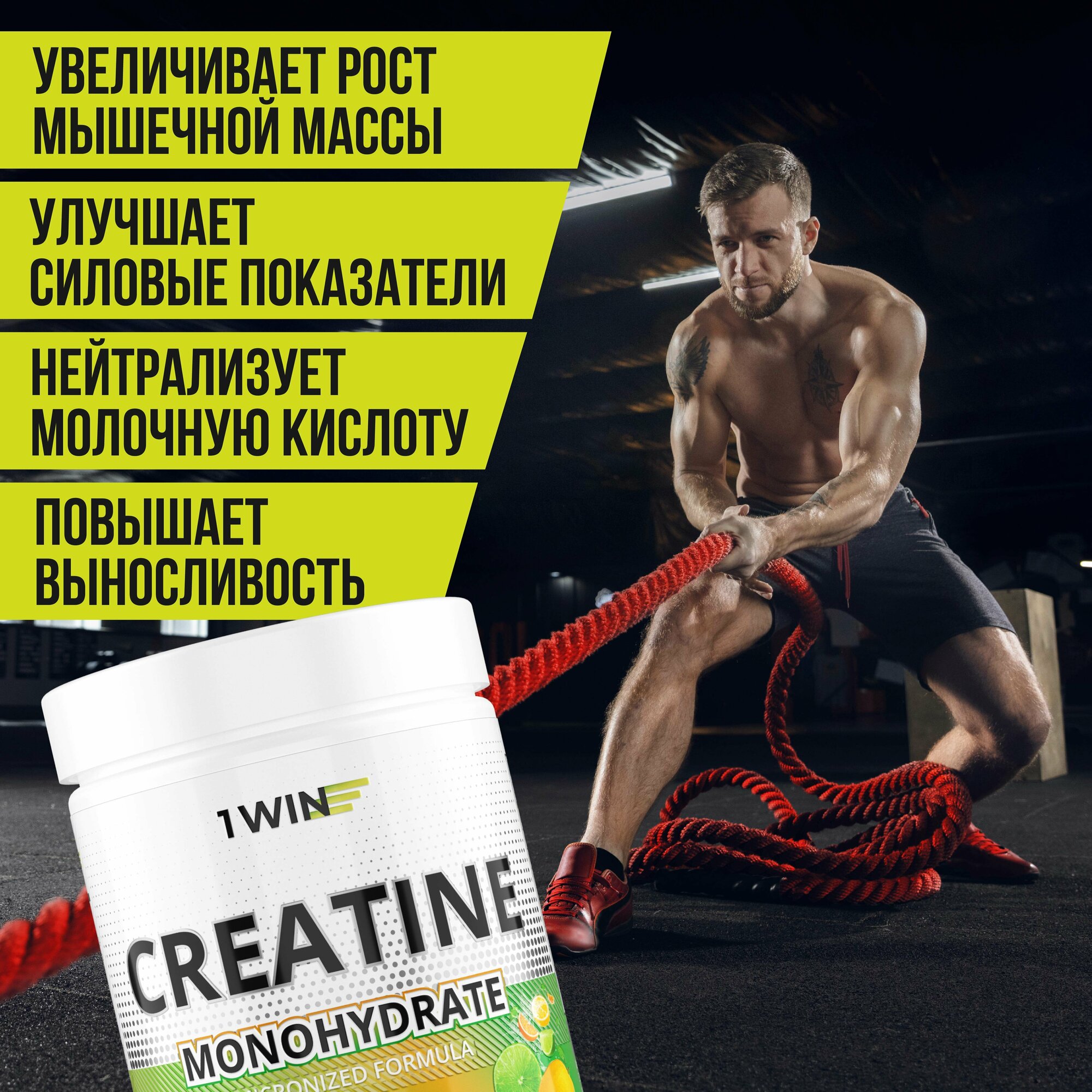 Креатин моногидрат порошок 1WIN, Creatine Monohydrate, Вкус Цитрусовый микс, 60 порций, спортивное питание для набора массы тела