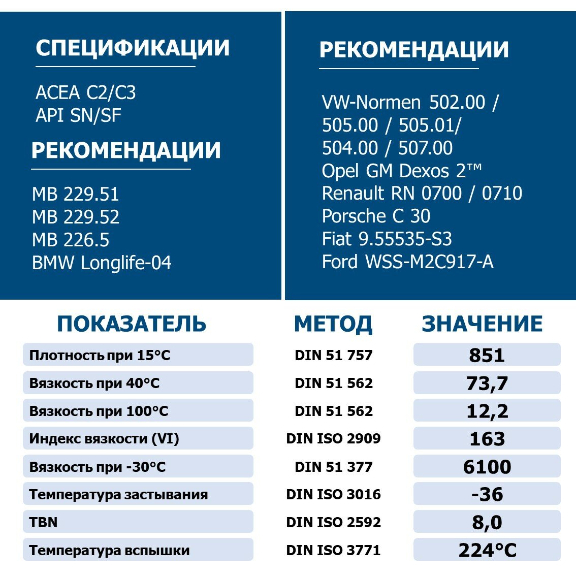 | Допуски OEM | VW 502.00/505.00 / FIAT 9.55535-S3 / BMW Longlife-04 / VW 505.01 / Renault RN 0710 / MB 226.5 / PORSCHE C30 / VW 504.00 / Renault RN 0700 / VW 507.00 / MB 229.52 / GM Dexos 2 / Ford WSS-M2C 917-A / MB 229.51 |