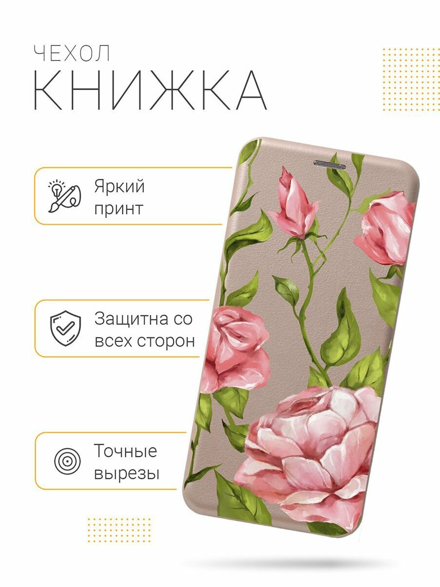 СохранитьЧехол-книжка на Xiaomi Redmi 8, Сяоми Редми 8 с 3D принтом "Amazing Roses" золотистый интересное: