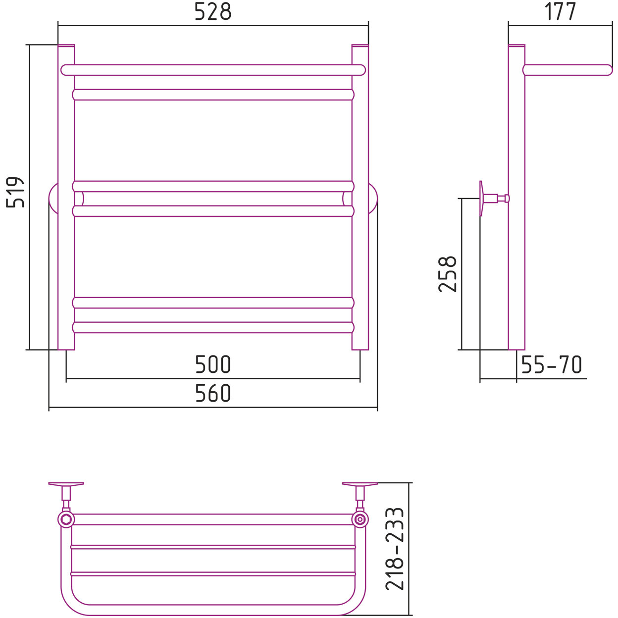 Полотенцесушитель водяной Стилье Универсал-56 600х500 (Полка +1+2+2) П 18 Без покрытия 00656-6050