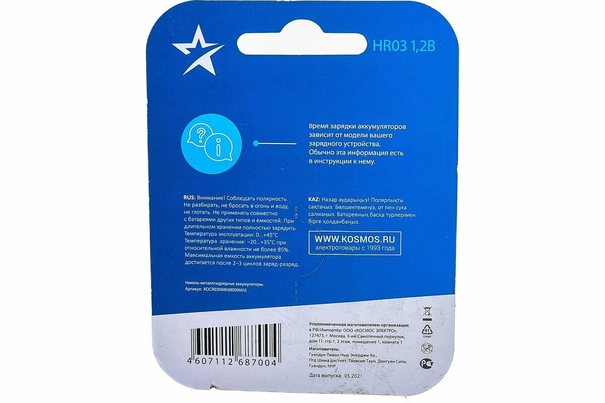 Космос Акк. R03 NI-MH 800 mAh 2BL KOCR03NIMH(800MAH)