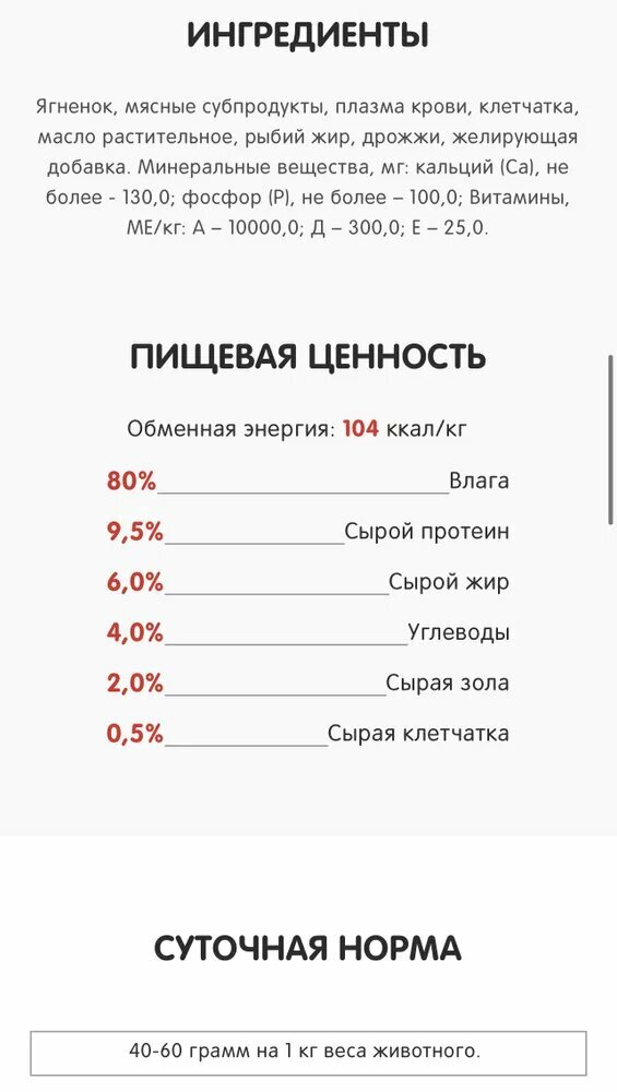 | Состав | Ягненок, мясные субпродукты, плазма крови, клетчатка, масло растительное, рыбий жир, дрожжи, желирующая добавка |