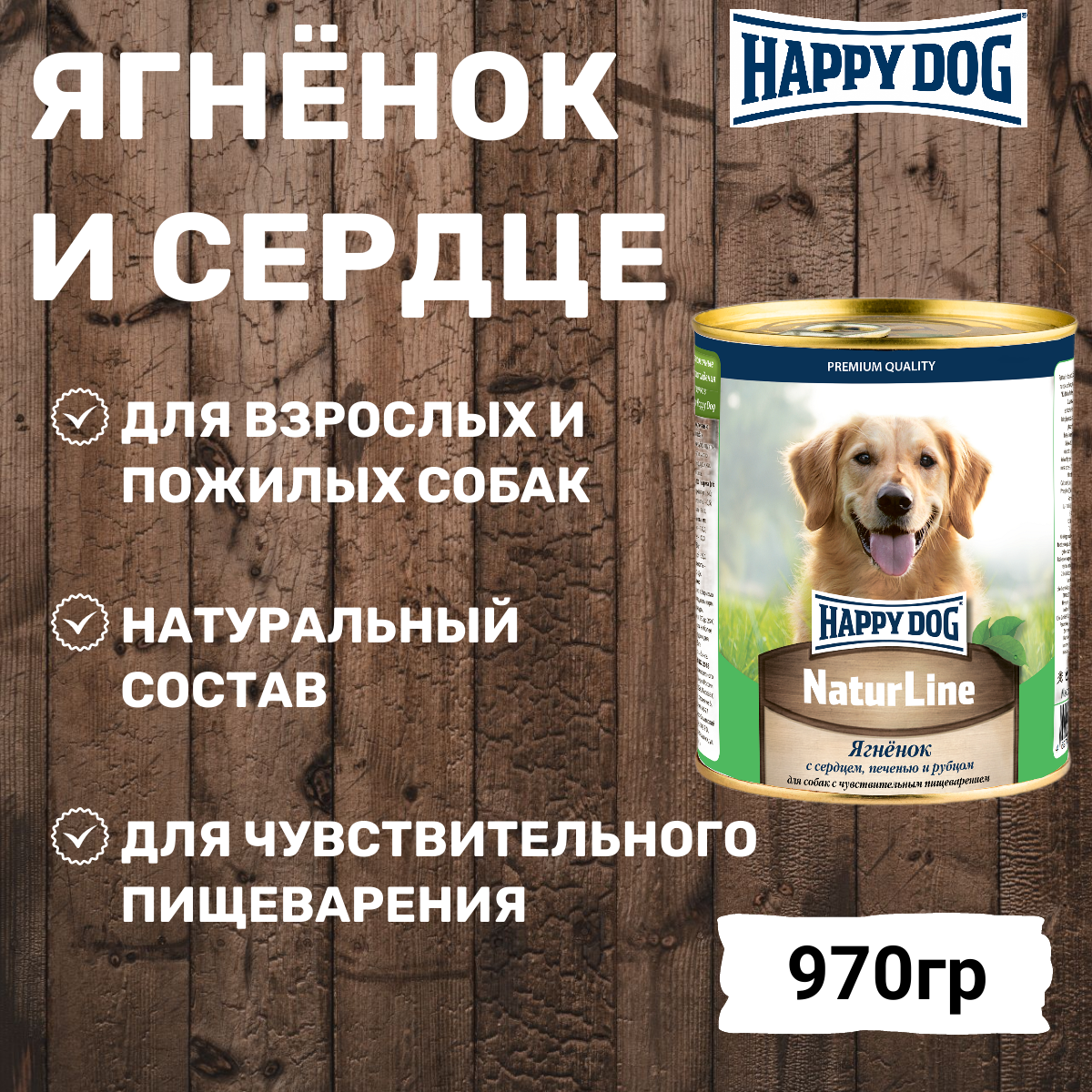 HAPPY DOG NATUR LINE для взрослых собак с ягненком, сердцем, печенью и рубцом (970 гр х 12 шт)