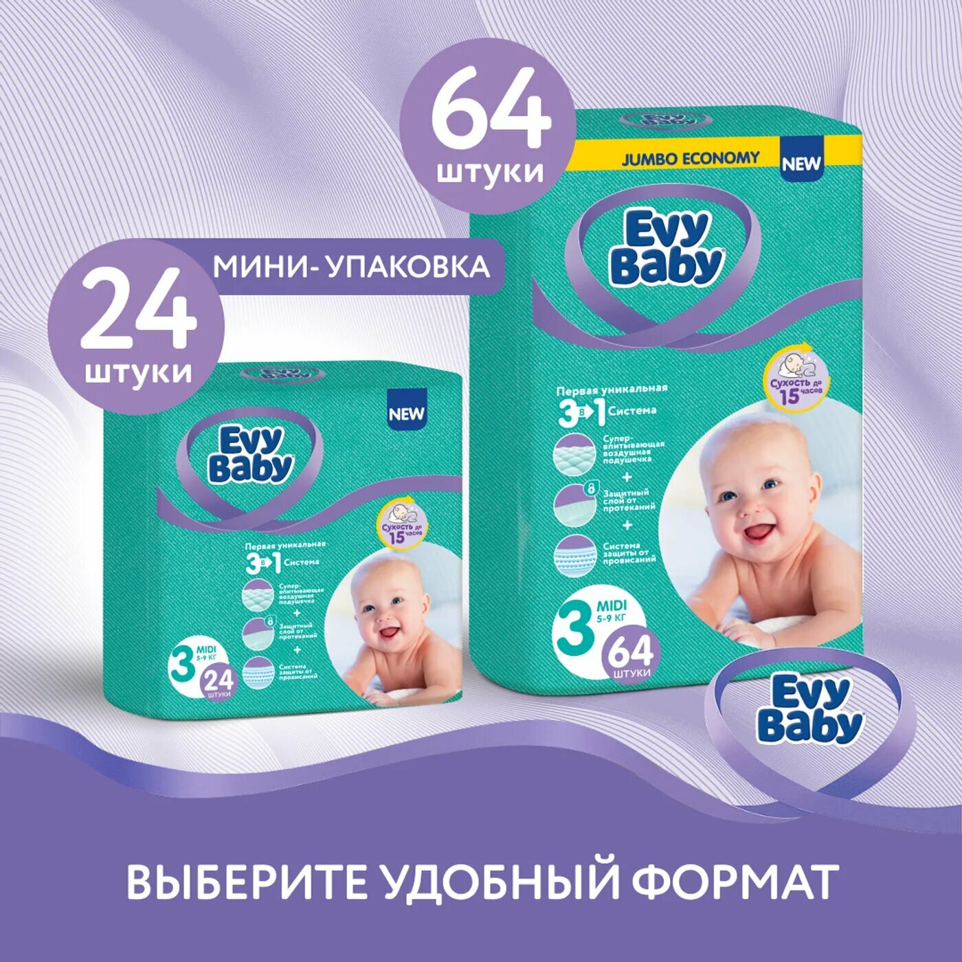 Ниже Вы можете прочитать отзывы на Подгузники Evy Baby Midi 5-9кг 3М 64шт, ознакомится с подробными характеристиками, посмотреть интересные обзоры и фотографии на Подгузники Evy Baby Midi 5-9кг 3М 64шт.