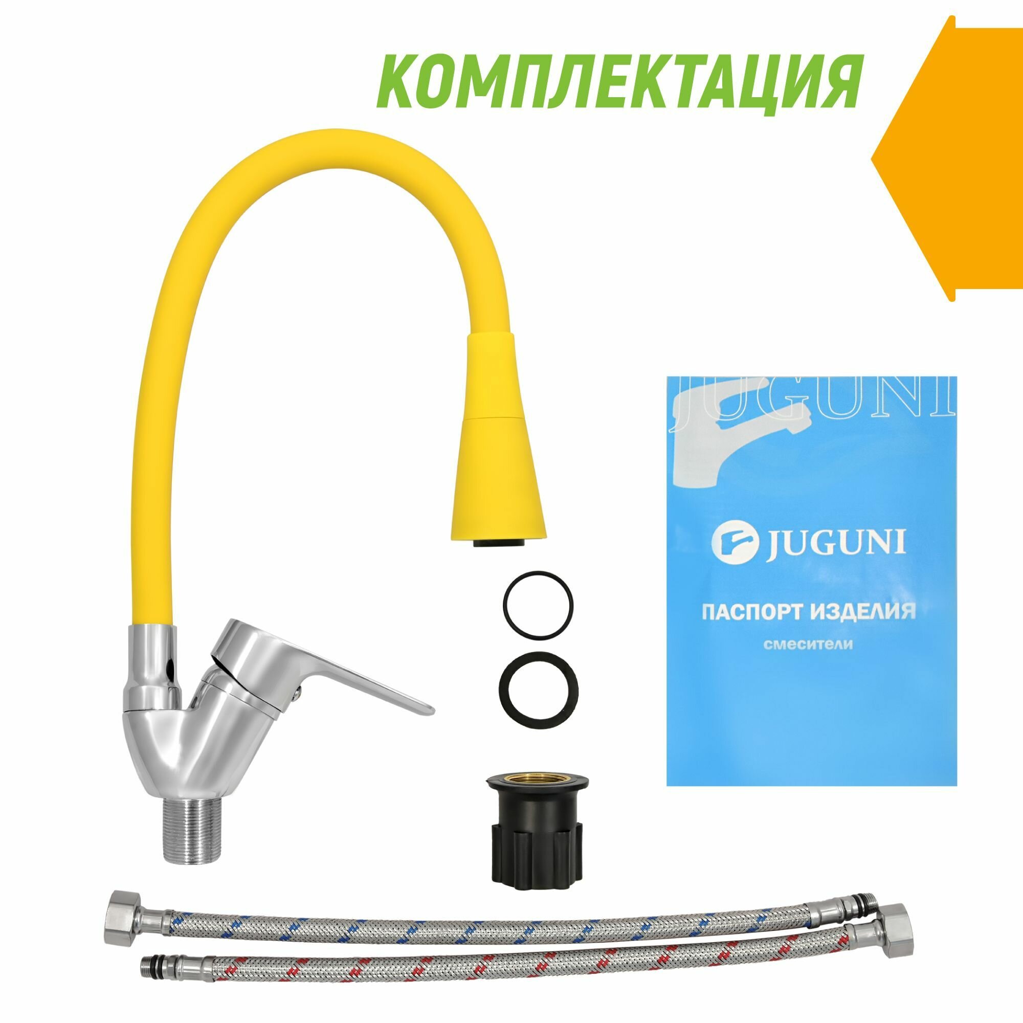 Смеситель для мойки одноручный с гибким изливом 2 режима (желтый), креп. гайка, Juguni 0402.150 интересное: