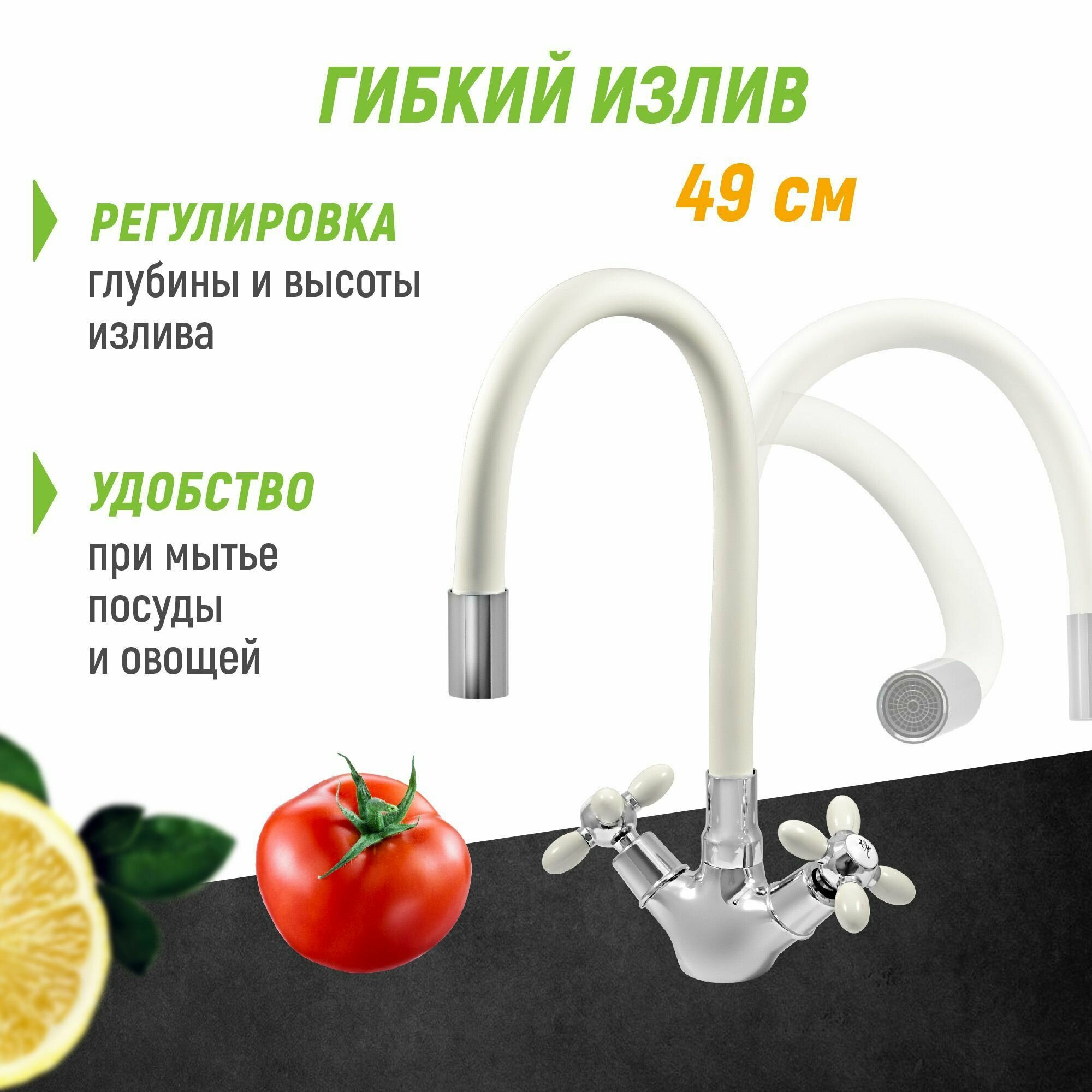 Смеситель для мойки двуручный с гибким силиконовым изливом (белый), креп. гайка, Juguni 0402.140