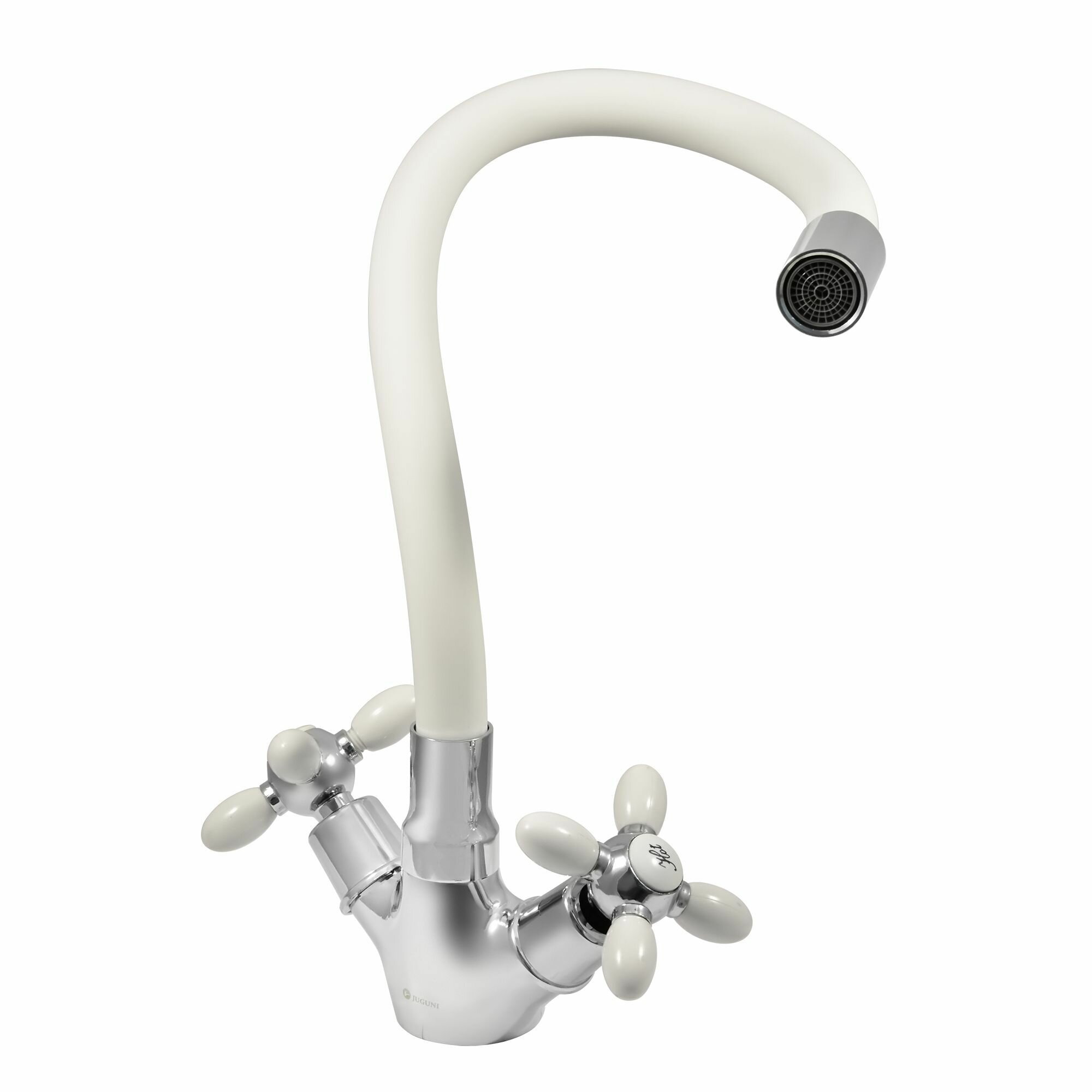 Смеситель для мойки двуручный с гибким силиконовым изливом (белый), креп. гайка, Juguni,Арт.: 0402.140