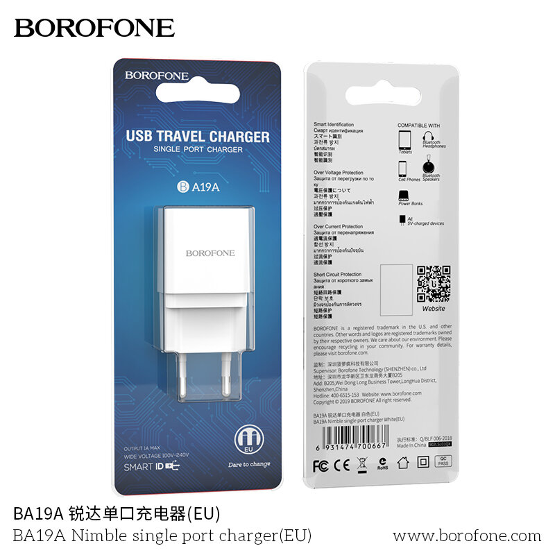 Зарядное устройство BOROFONE BA19A один порт USB, 5V, 1.0A, белый, 6931474700667
