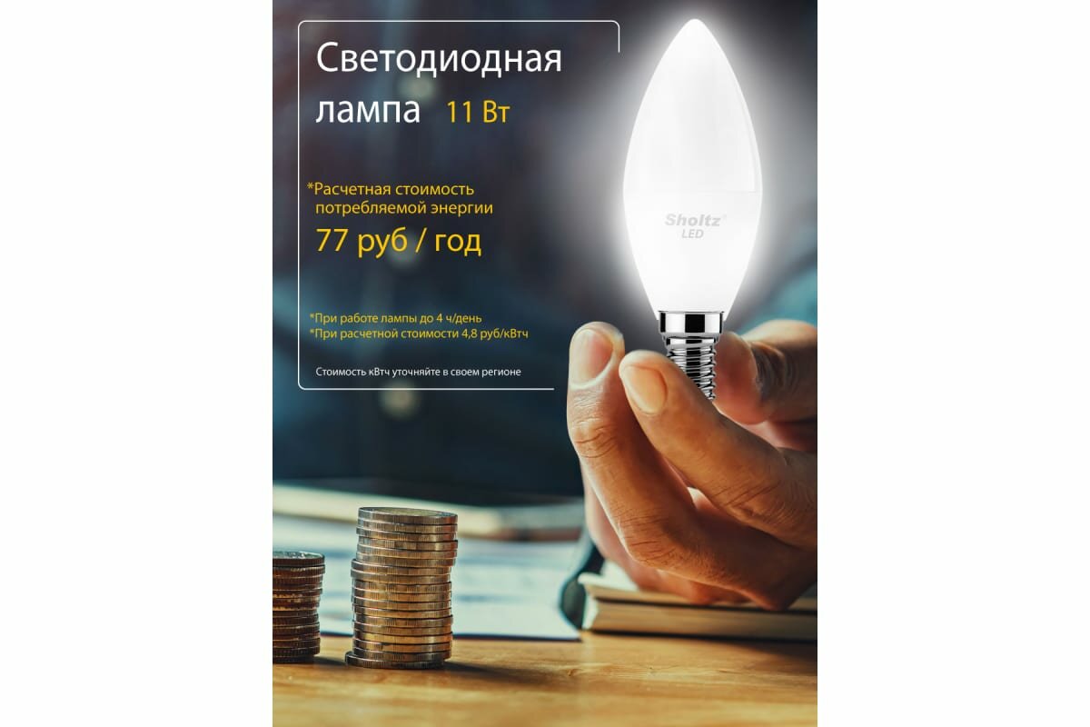 Светодиодная лампа Sholtz свеча 11Вт E14 2700К C37 220-240В керамика + пластик