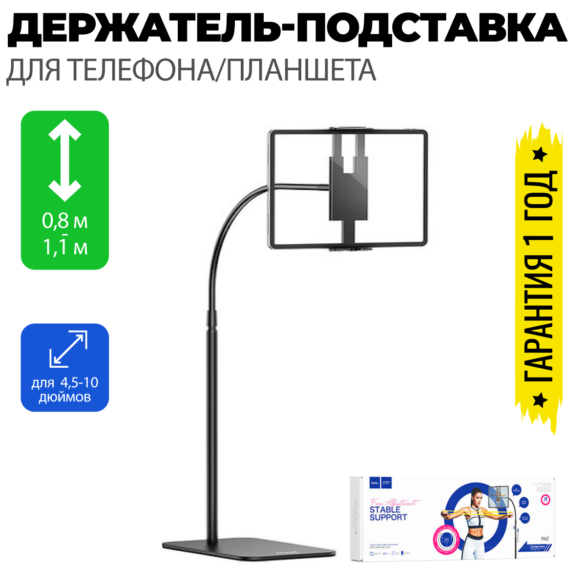 Держатель настольный Hoco PH42 Black для телефона и планшета 4.5-10 дюймов, регулируемый, черный