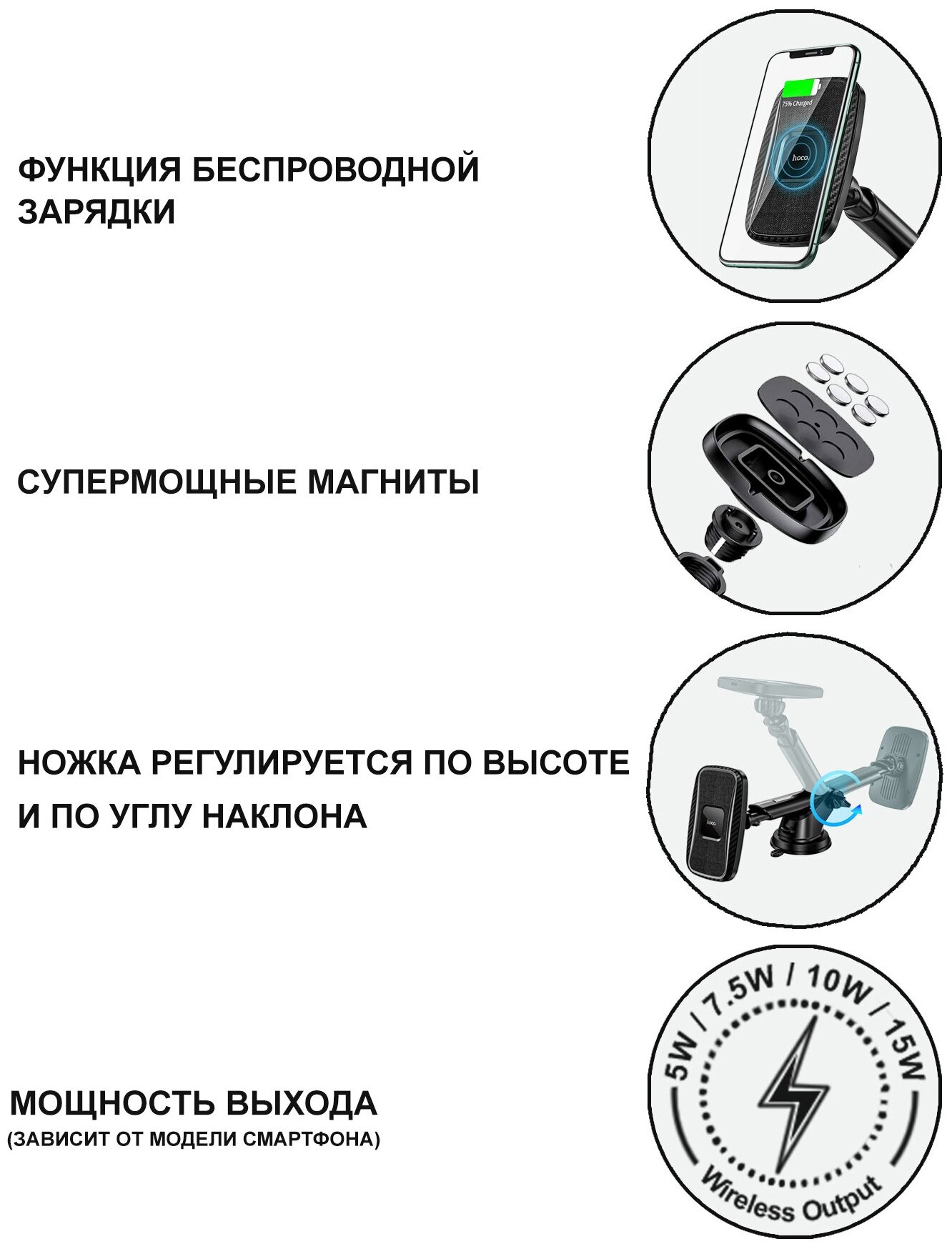 Держатель автомобильный HOCO CA75 15W "с функцией беспроводная зарядка", черный