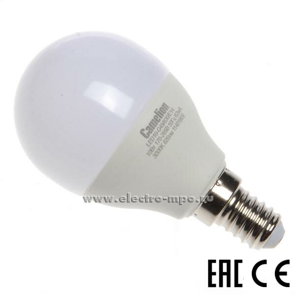 Эл.лампа светодиодная шар LED10-G45/830/E14 (10W= 90 Вт 820 Lm) Camelion