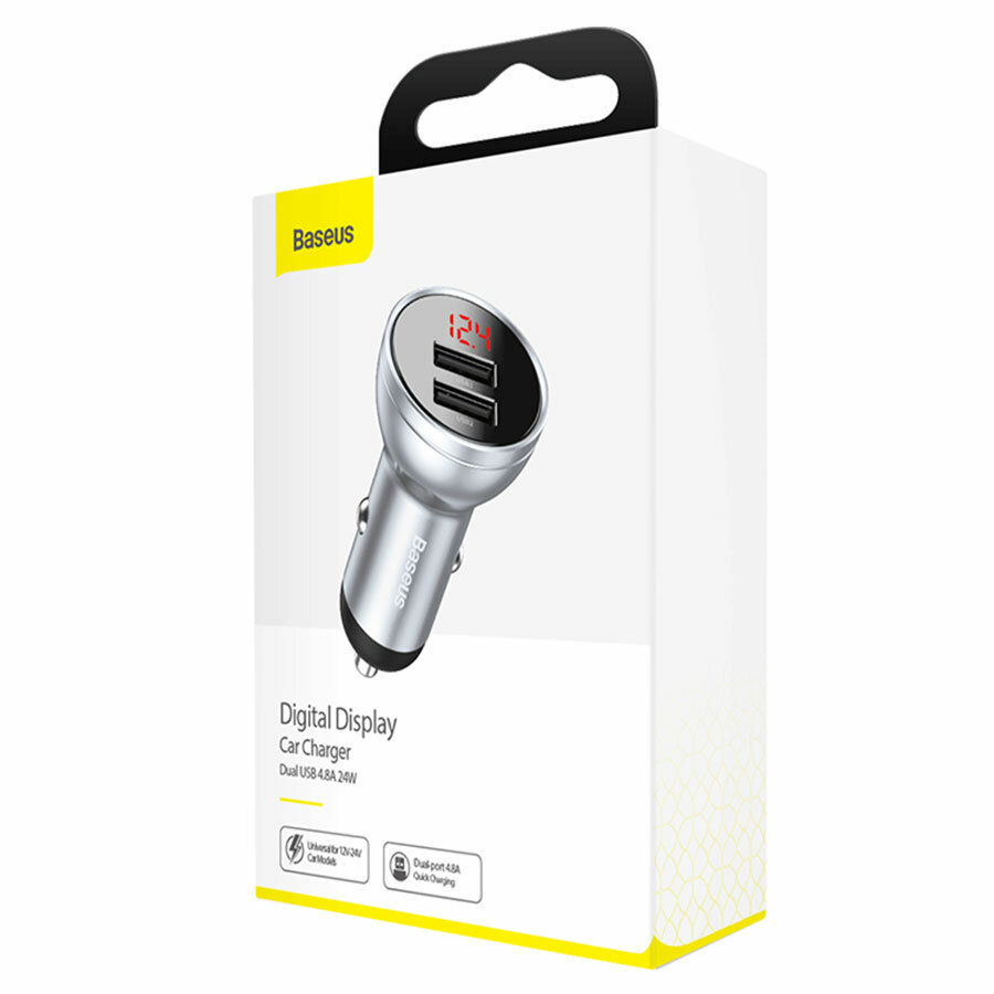 Купить Автомобильное зарядное устройство BASEUS Digital Display Dual, 2xUSB, 2.4A, 24W, серебристый