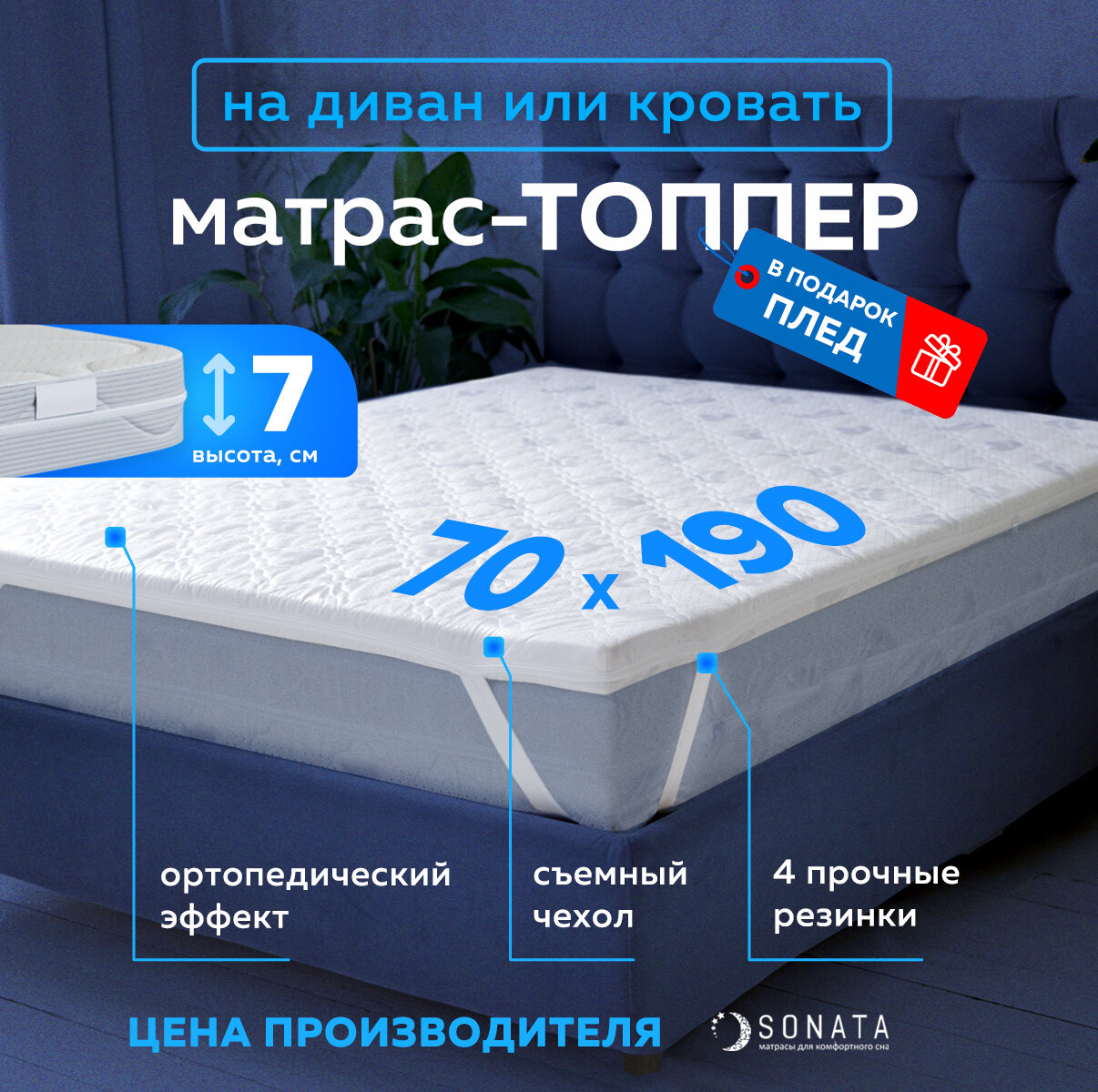 Купить Топпер матрас 70х190 см SONATA, Беспружинный, высота 7 см, Съемный чехол, Плед в подарок