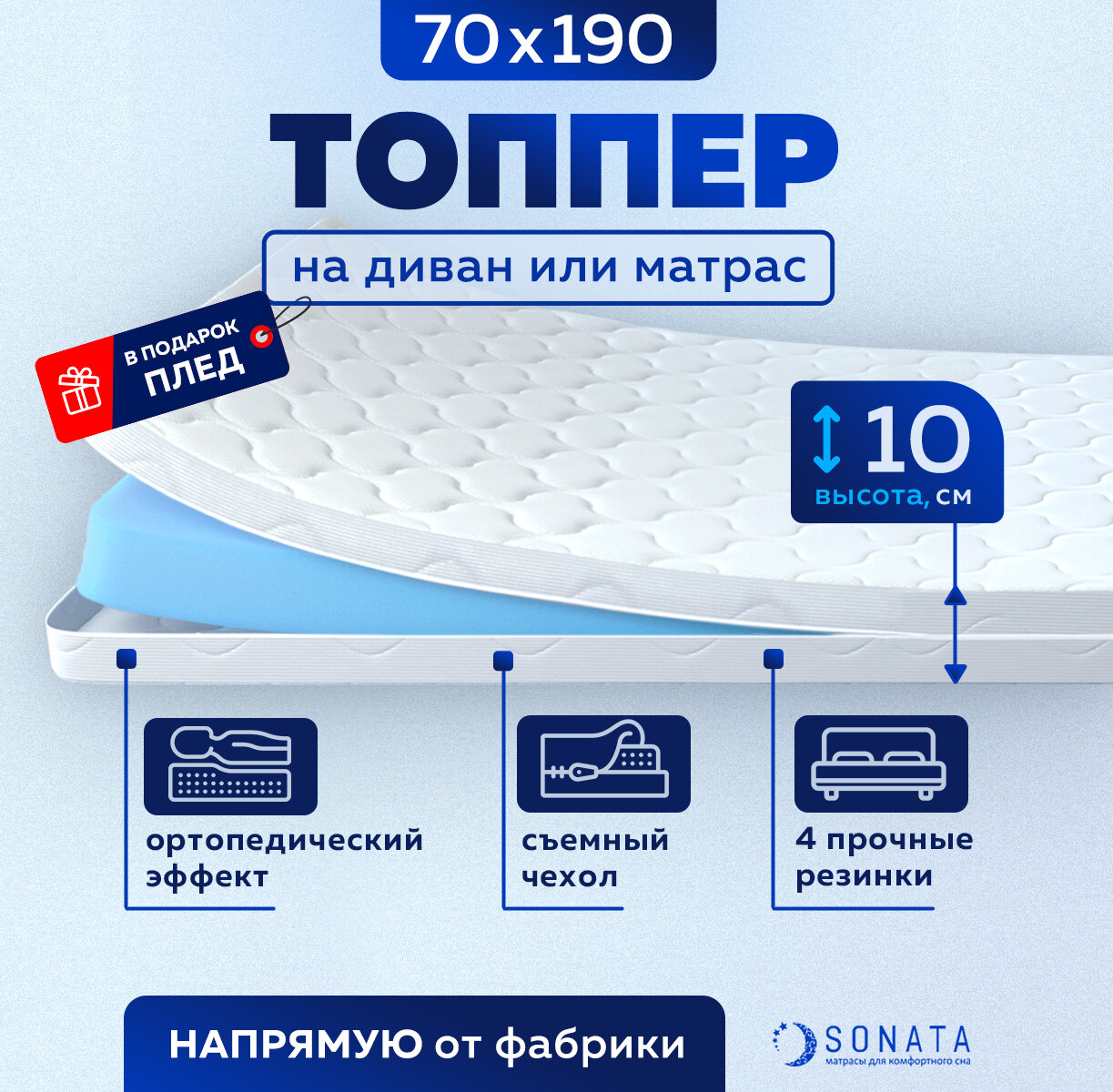 Купить Топпер матрас 70х190 см SONATA, Беспружинный, высота 10 см, Съемный чехол, Плед в подарок
