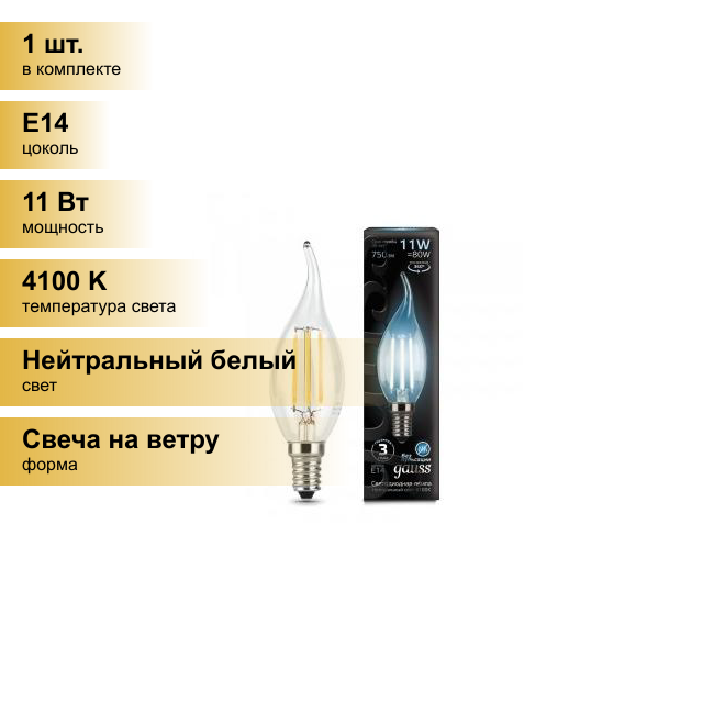 (2 шт.) Светодиодная лампочка Gauss Filament Свеча на ветру E14 11W 750lm 4100K 4K прозр. филамент (нитевидная) 104801211