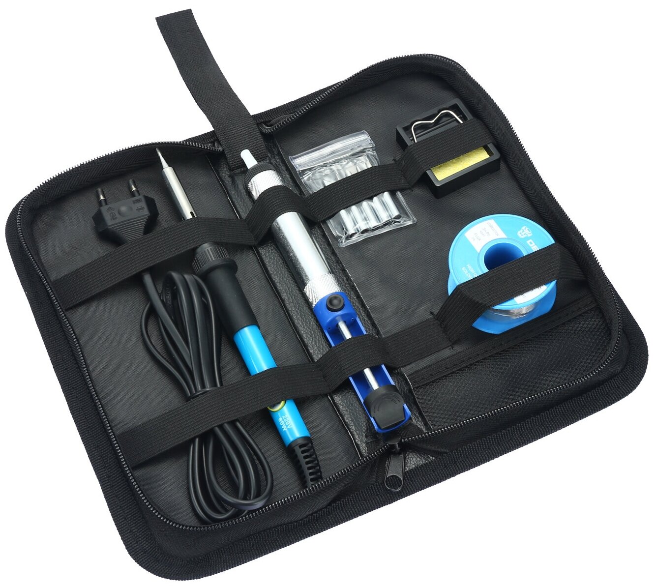 | Комплектация | паяльник 60 Вт, 220 В (1 шт.), комплект из 5 типов наконечников (конус, игла, клин, скос и ножевидное), держатель для паяльника (1 шт.), губка для очистки паяльного жала (1 шт.), припой на катушке (1 шт.), оловоотсос для припоя (1 шт.), пенал на молнии (1 шт.). |
