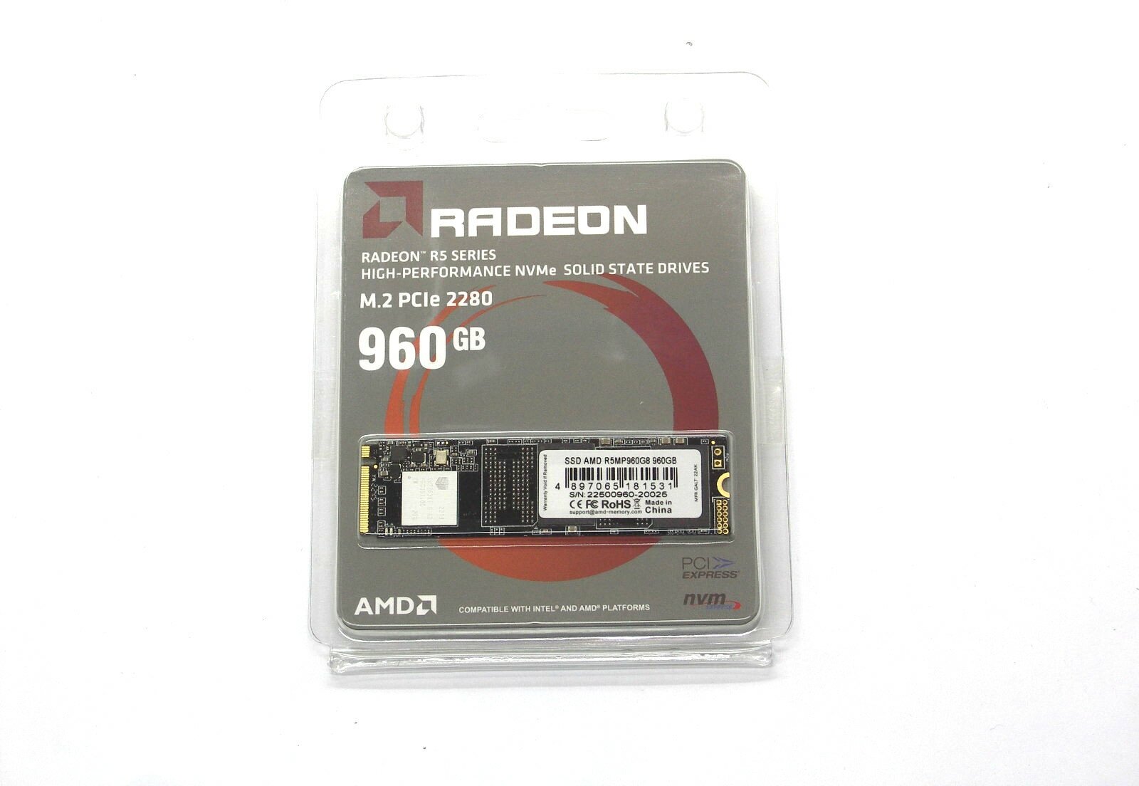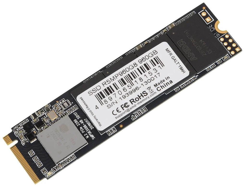 Твердотельный накопитель SSD AMD Radeon R5 960GB M.2 2280 R5MP960G8 Client PCIe Gen3x4 with NVMe, 2100/1900, IOPS 248/233K, MTBF 2M, 3D TLC, 480TBW, R