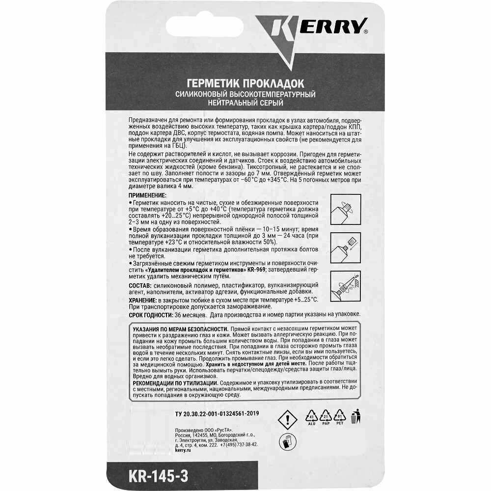 Kerry 145-3 герметик прокладок высокотемпературный нейтральный серый 85 гр., KERRY KR1453 (1 шт.)