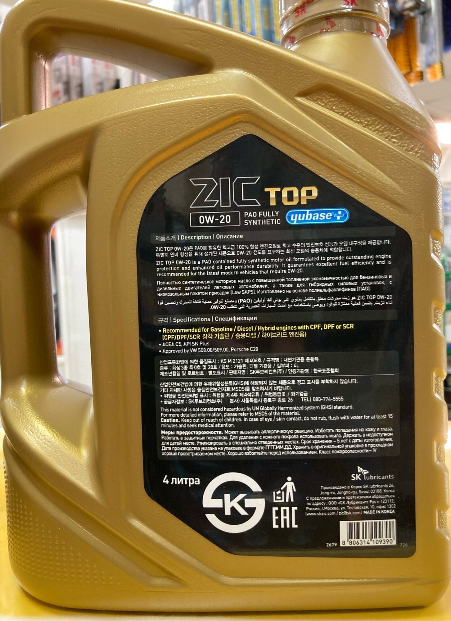 ZIC 162679 Масло моторное 0W20 ZIC TOP 4л синтетика SN+/C5 VW 508.00/509.00