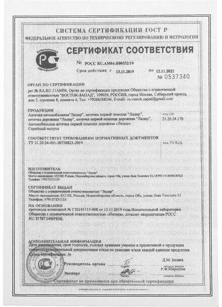 Аптечка первой помощи дорожная, состав РФ 2024