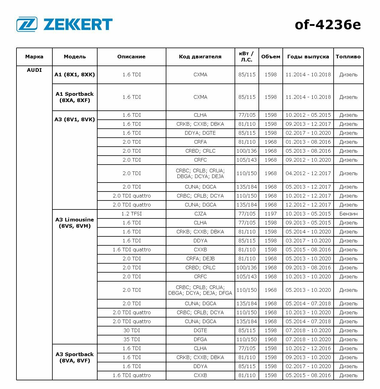 OF4236E ZEKKERT Фильтр масл. Eco VW Polo VI 17- Passat VIII 14- Tiguan I II 10- Audi A6 IV 13- A4 IV V 07- Sk