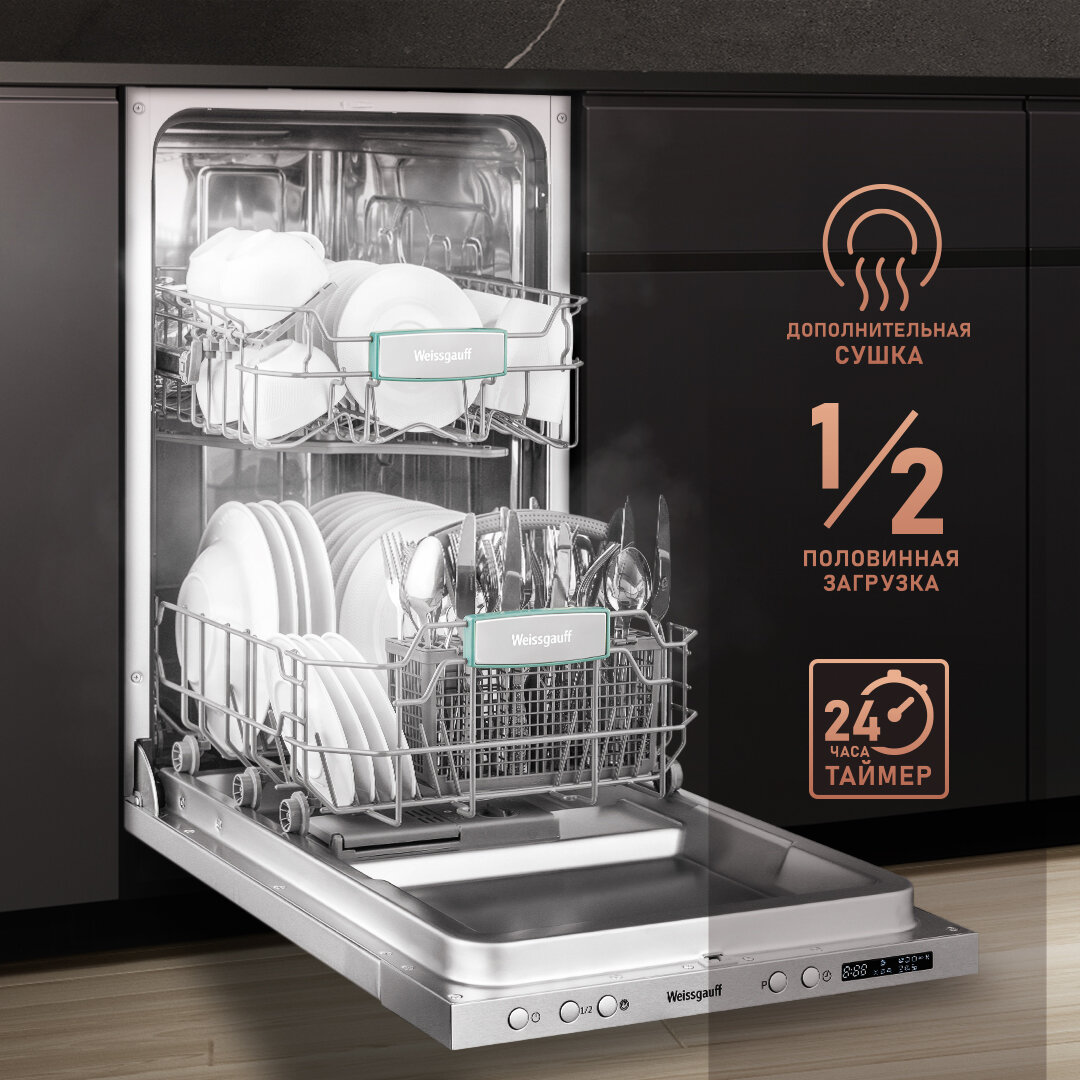 Встраиваемая посудомоечная машина с лучом на полу Weissgauff BDW 4543 D (модификация 2024 года),3 года гарантии, 11 комплектов, 7 программ, полная защита от протечек, автопрограмма Blitz Wash, половинная загрузка, дополнительная сушка