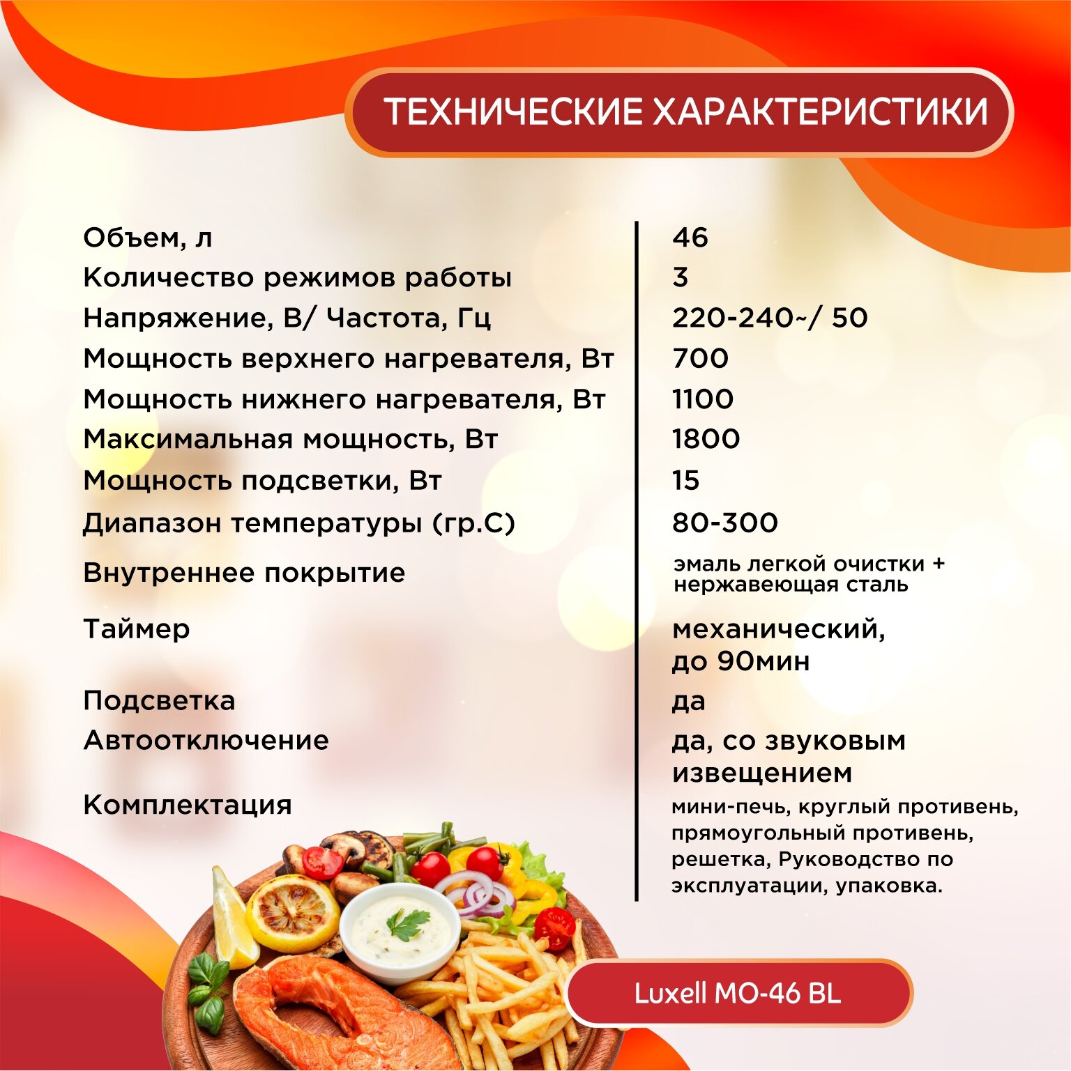 Ниже Вы можете прочитать отзывы на Мини-печь электрическая LUXELL MO-46 BL, 46 литров, черный, ознакомится с подробными характеристиками, посмотреть интересные обзоры и фотографии на Мини-печь электрическая LUXELL MO-46 BL, 46 литров, черный.