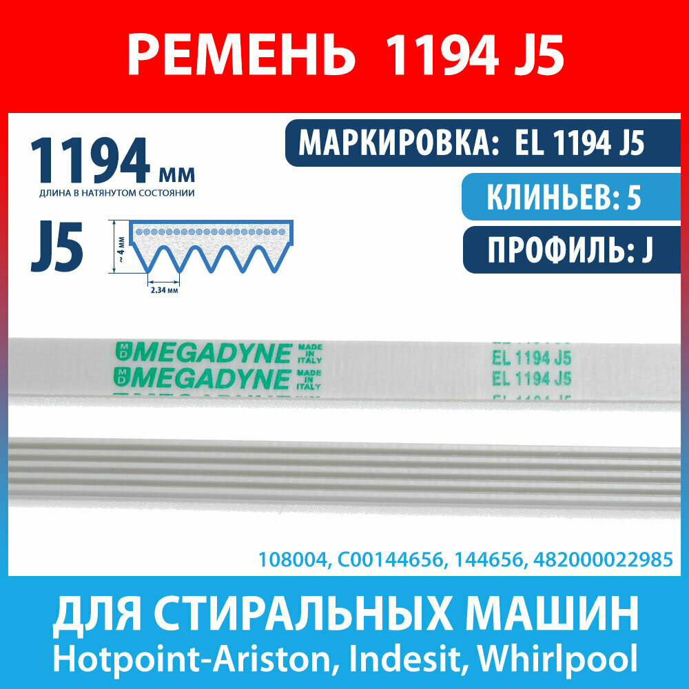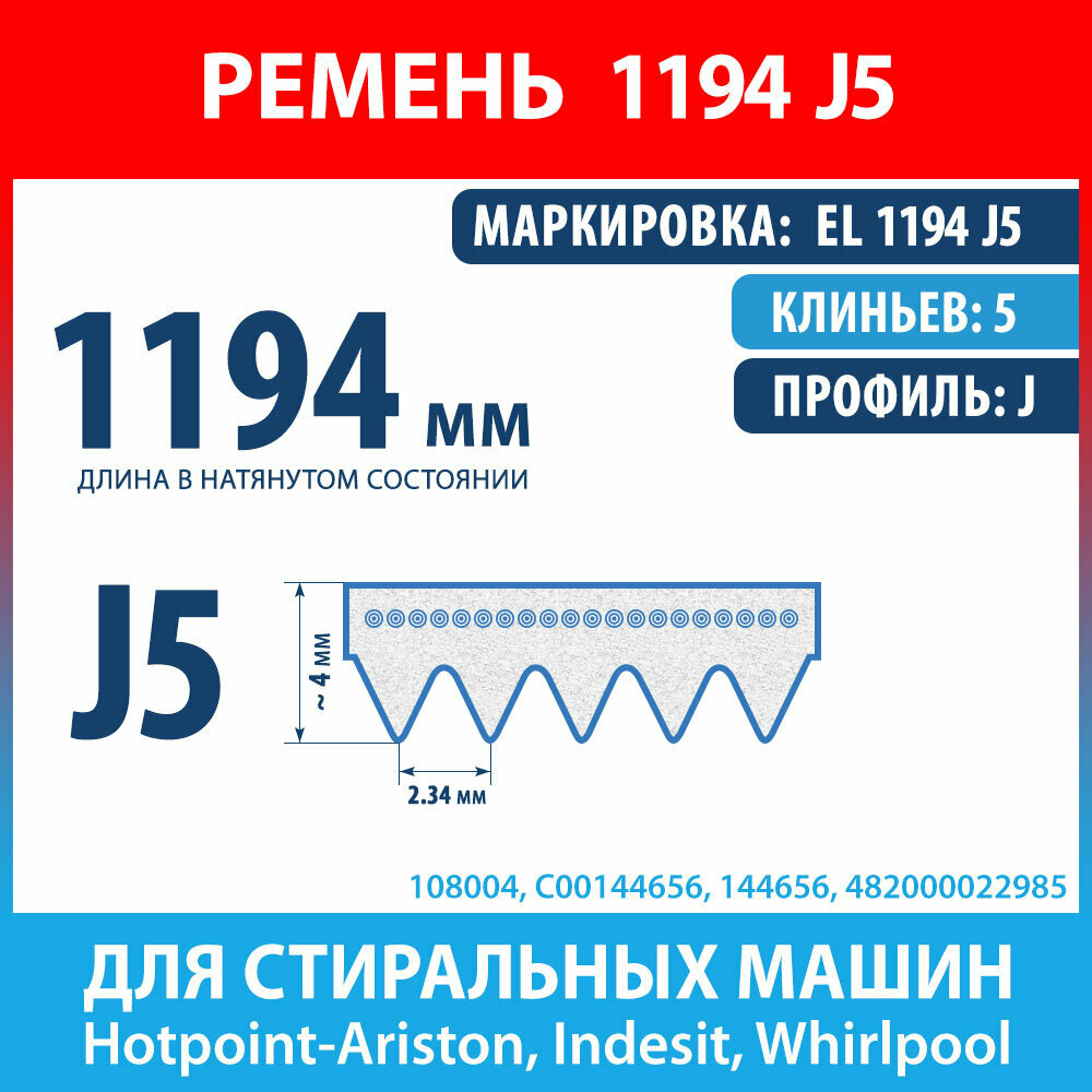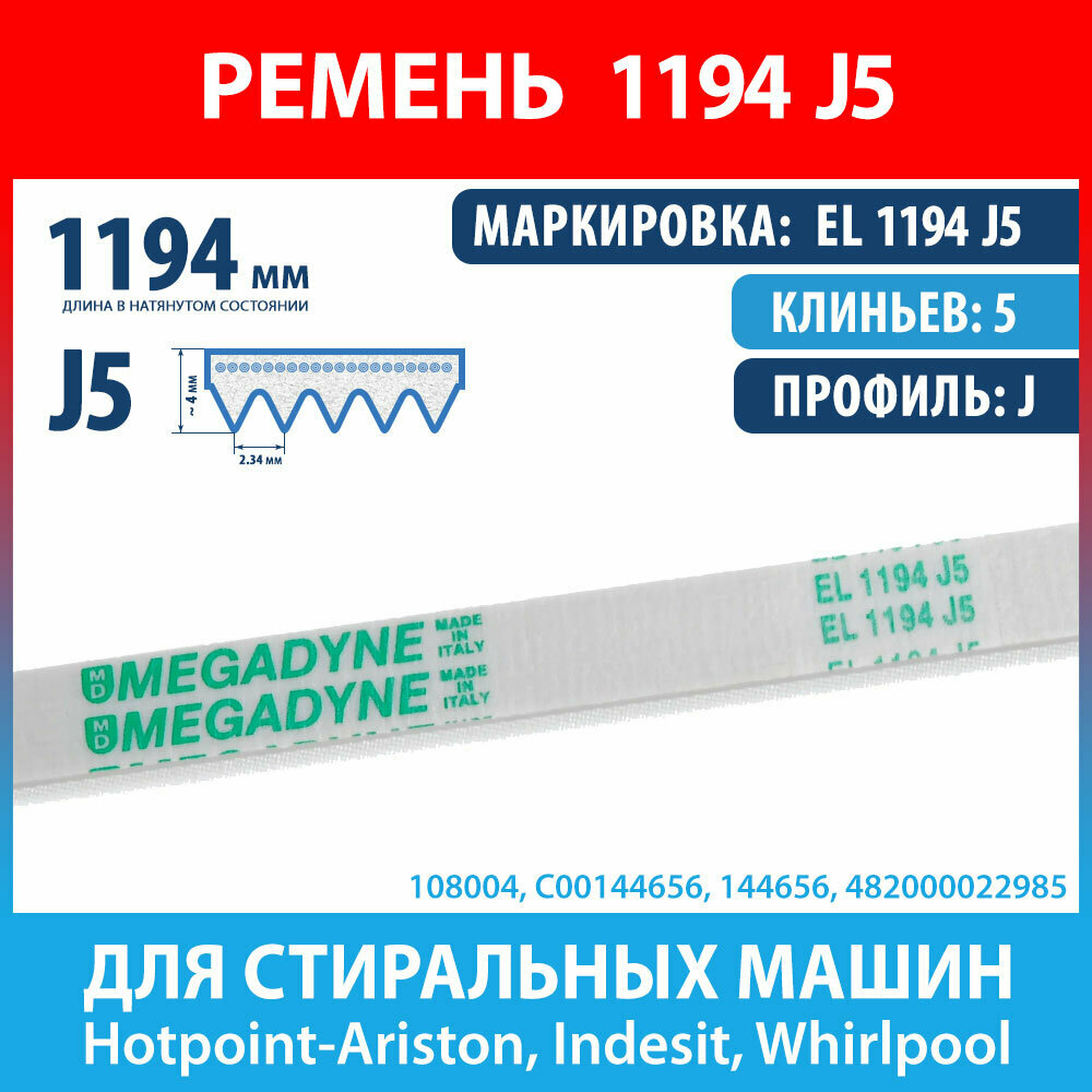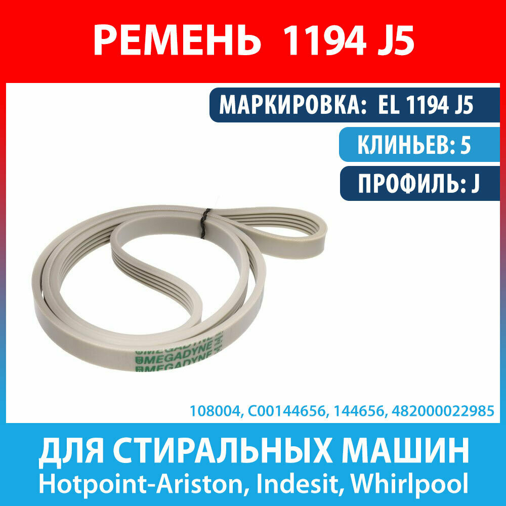 Ремень для стиральной машины Indesit, Ariston, Hotpoint 1194 J5 EL 1194 J5 EL WN751, 029794, 1501029, C00029794, C00144656, 482000026146, 482000022985