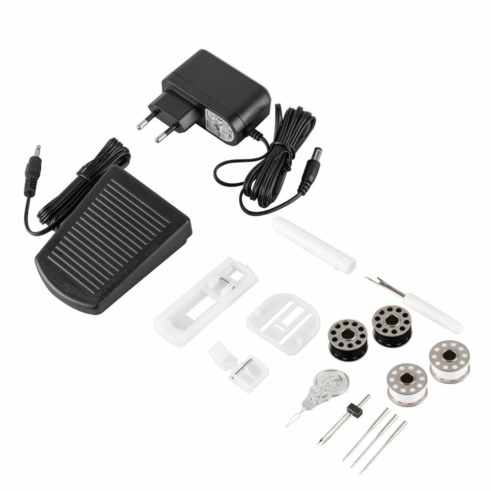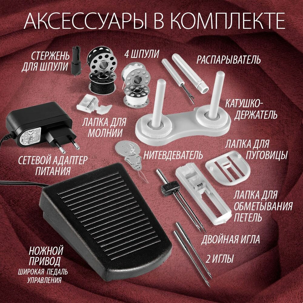 | Комплектация | шпулька - 4 шт., иглы - 3 шт., двойная игла, инструмент для заправки нити, ножной привод, сетевой адаптер питания (6V 1500mA), катушкодержатель, лапка для обметывания петель, распарыватель, лапка для пришивания молнии |