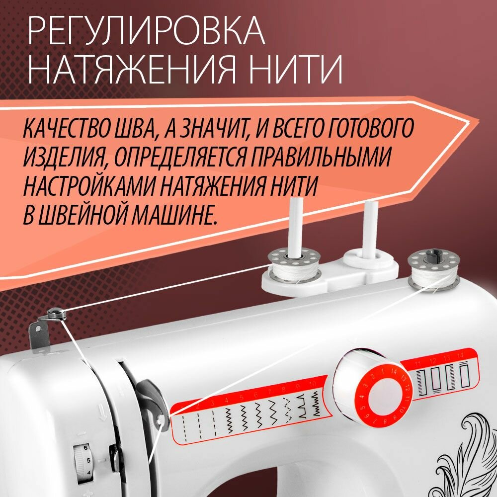 | Дополнительная информация | скорость шитья 300±50 об/мин, 14 видов строчки, в том числе обработка петли для пуговицы, автоматическая намотка нити, обработка петель и пришивание пуговиц, регулируемое натяжение нити, встроенная LED-подсветка, прямой и обратный ход при шитье, нитеобрезатель, двойная игла |