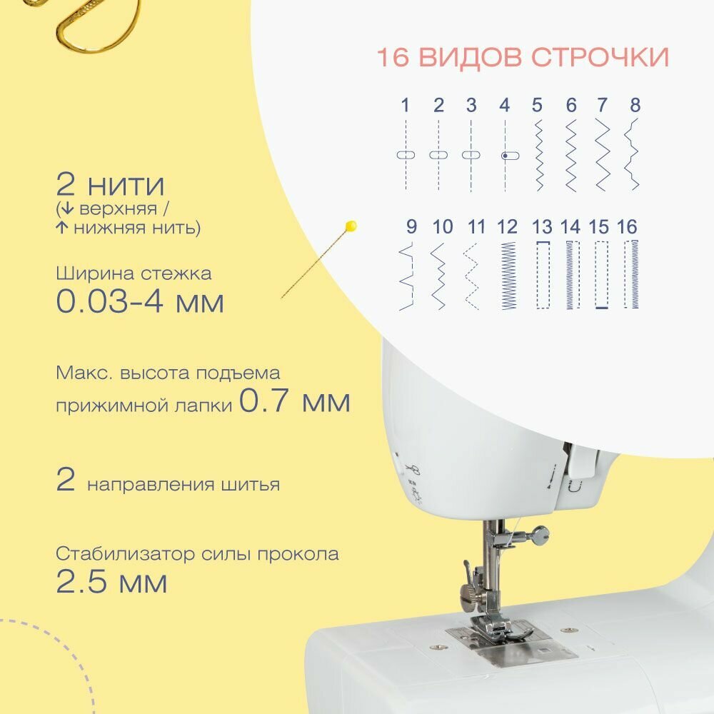 | Дополнительная информация | скорость шитья - 300±40 об/мин, две скорости работы, 16 видов строчки, прямой и обратный ход при шитье, обработка петли для пуговиц, удобная система заправки нити, автоматическая намотка нити, Отсек для аксессуаров, питание от адаптера 12V 2000 mA, потребляемая мощность 12V 2000 mA |