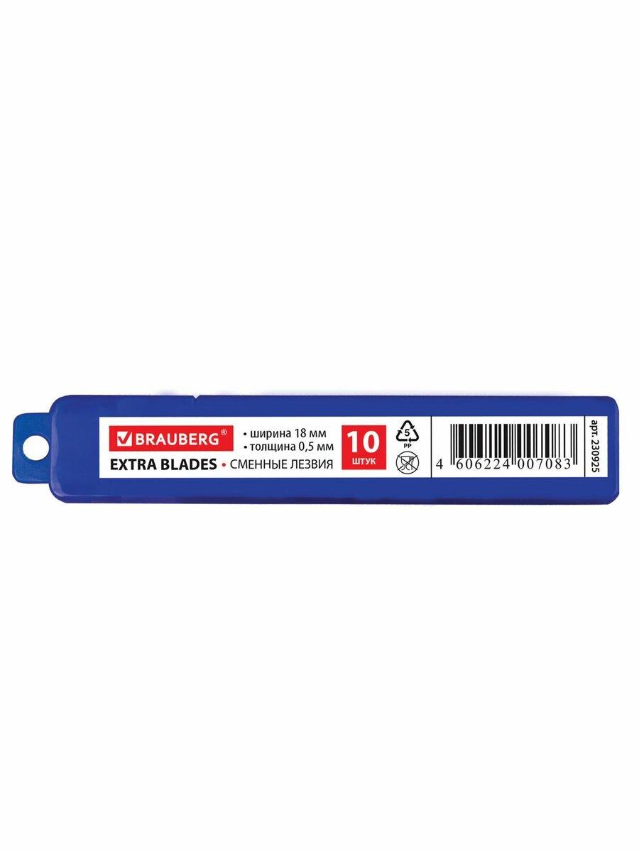 Лезвия для ножей 18 мм BRAUBERG, комплект 10 шт., толщина лезвия 0,5 мм, в пластиковом пенале, 230925 (цена за 1 ед.товара)